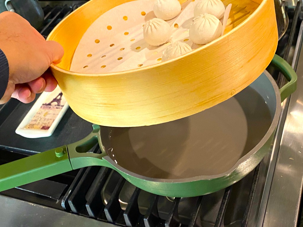 My wife had already bought me a bamboo insert for my deep dish frying pan, so I set it on the stove with an inch of water as a base, and started to lay out my frozen dumplings: