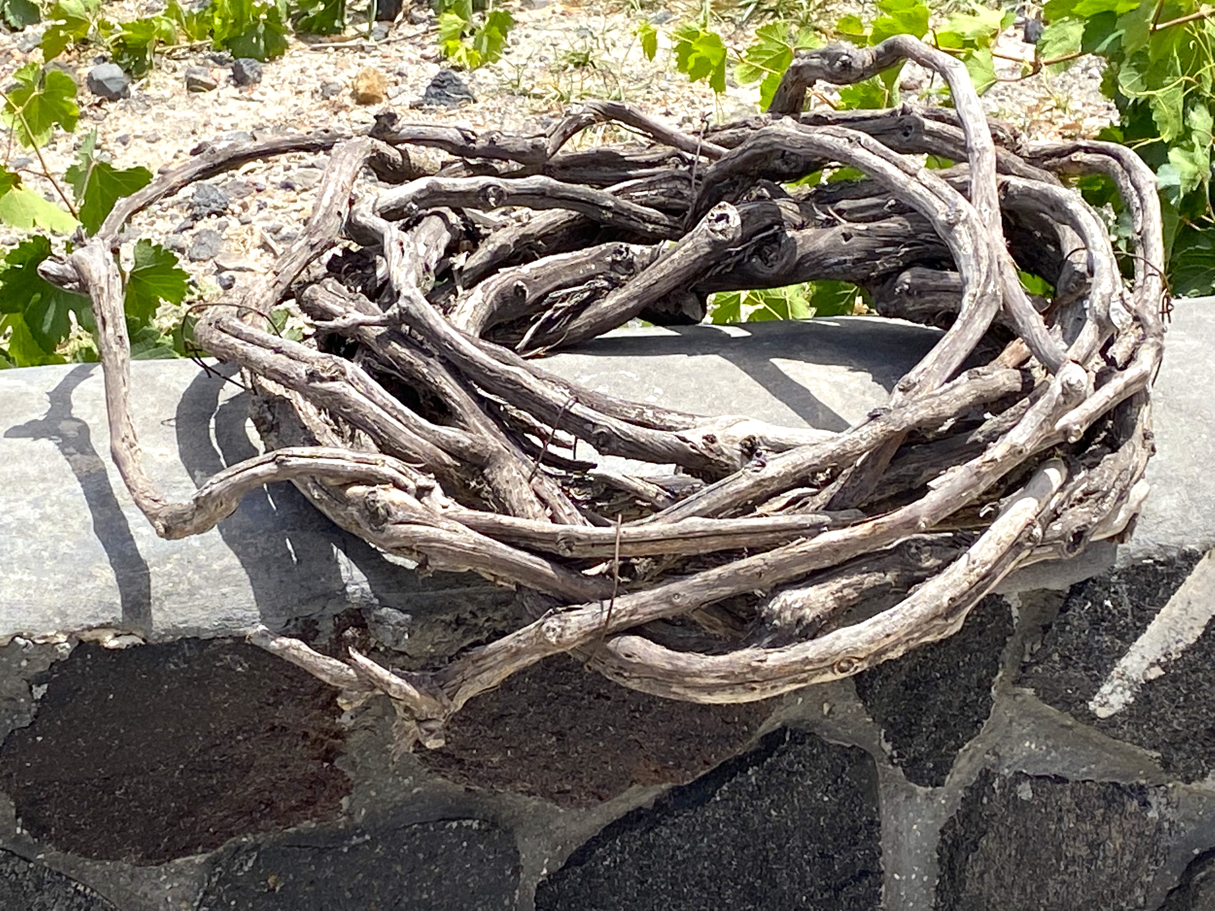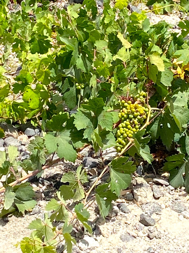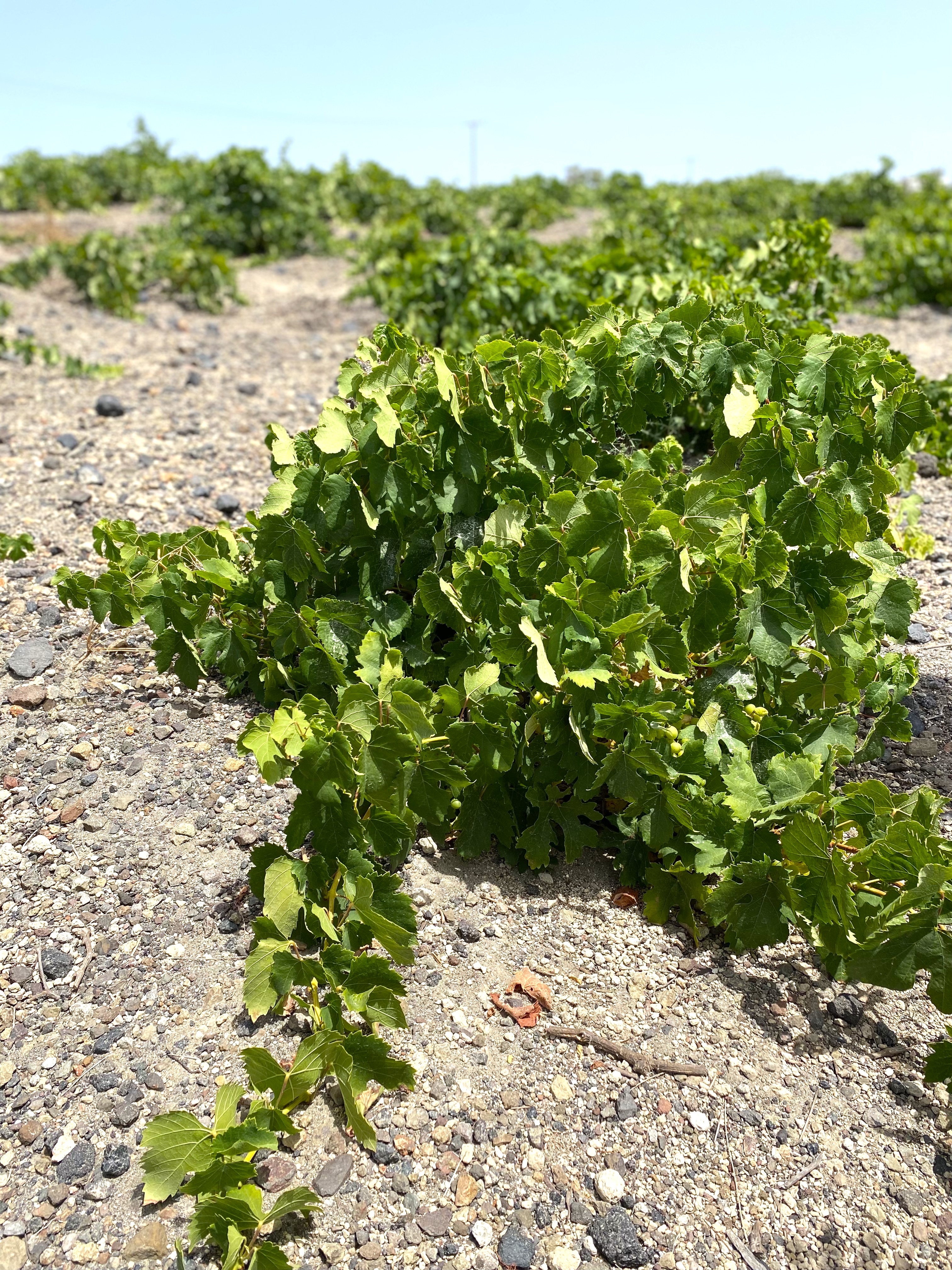 The soil is composed of volcanic ash and rocks. The subsoils – called “calcareous” – are porous, which helps retain the humidity in the air and release it as moisture in the night for the vines to use!