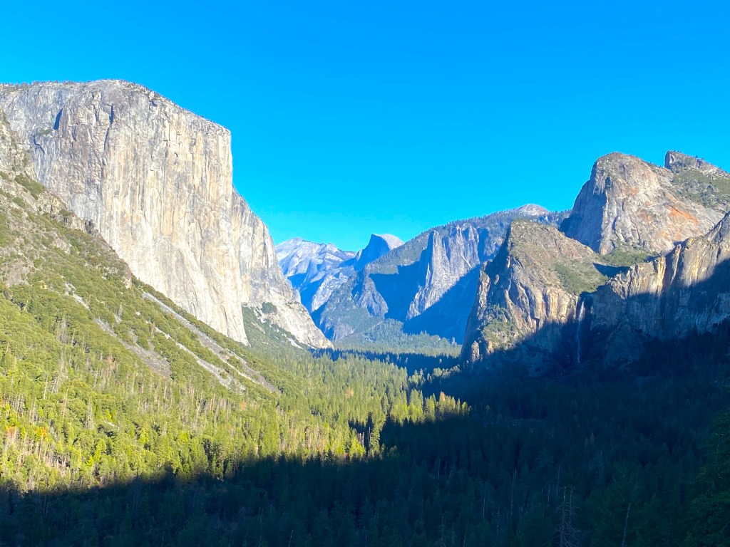 For those who are new to it, Yosemite National Park is in California’s Sierra Nevada mountains. It’s famed for the massive granite cliffs of El Capitan there on the left – I took this photo in late afternoon as the sun sends dramatic shadows over the mountains – and the iconic Half Dome is in the middle at the far back of the shot.