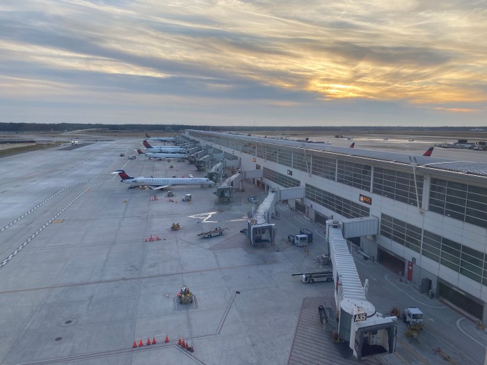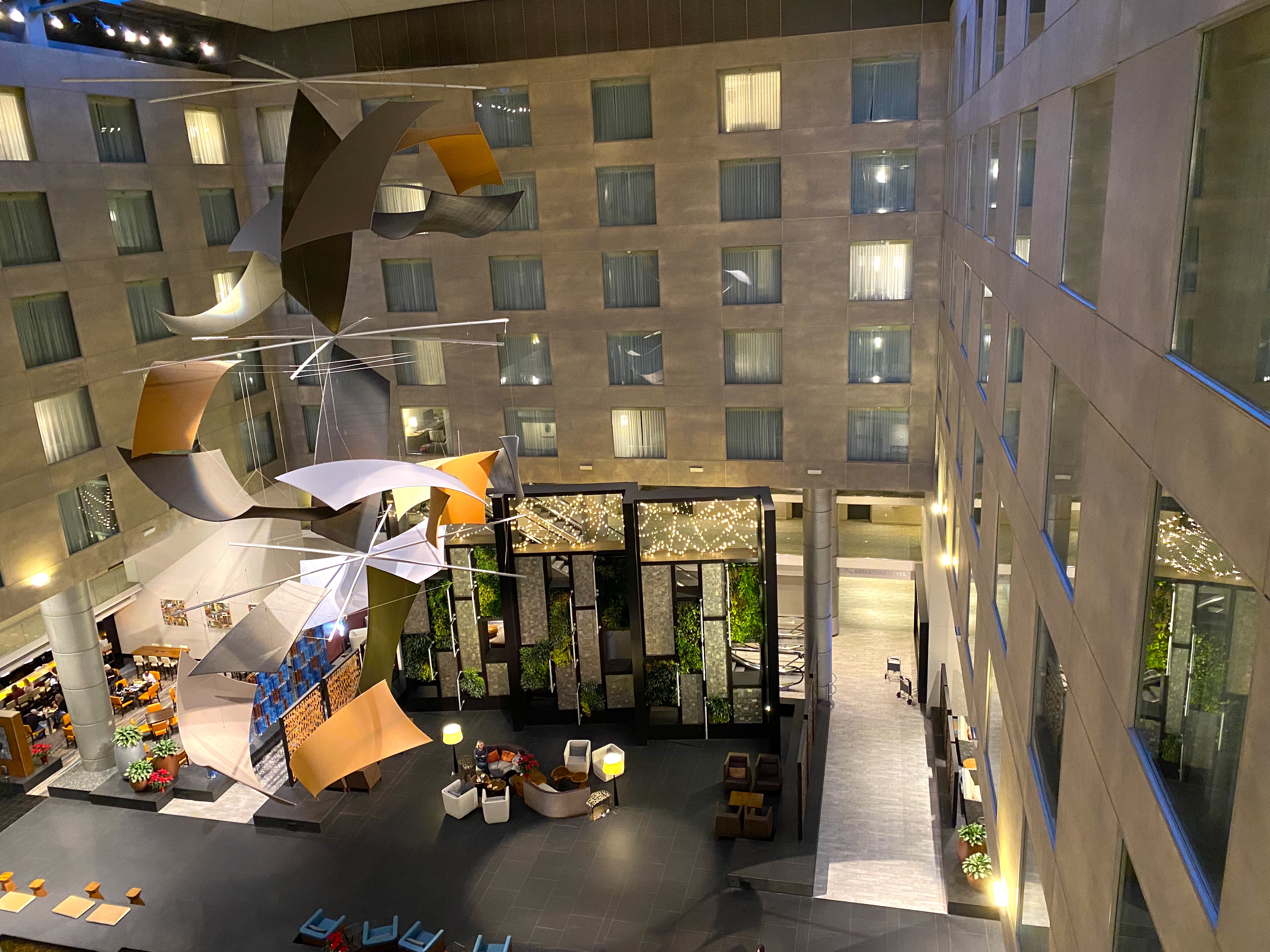 It was a very unplanned night in the Detroit Airport Hilton – the shot of these planes was our actual view from our hotel room – but the place had great room service and a fun atrium: