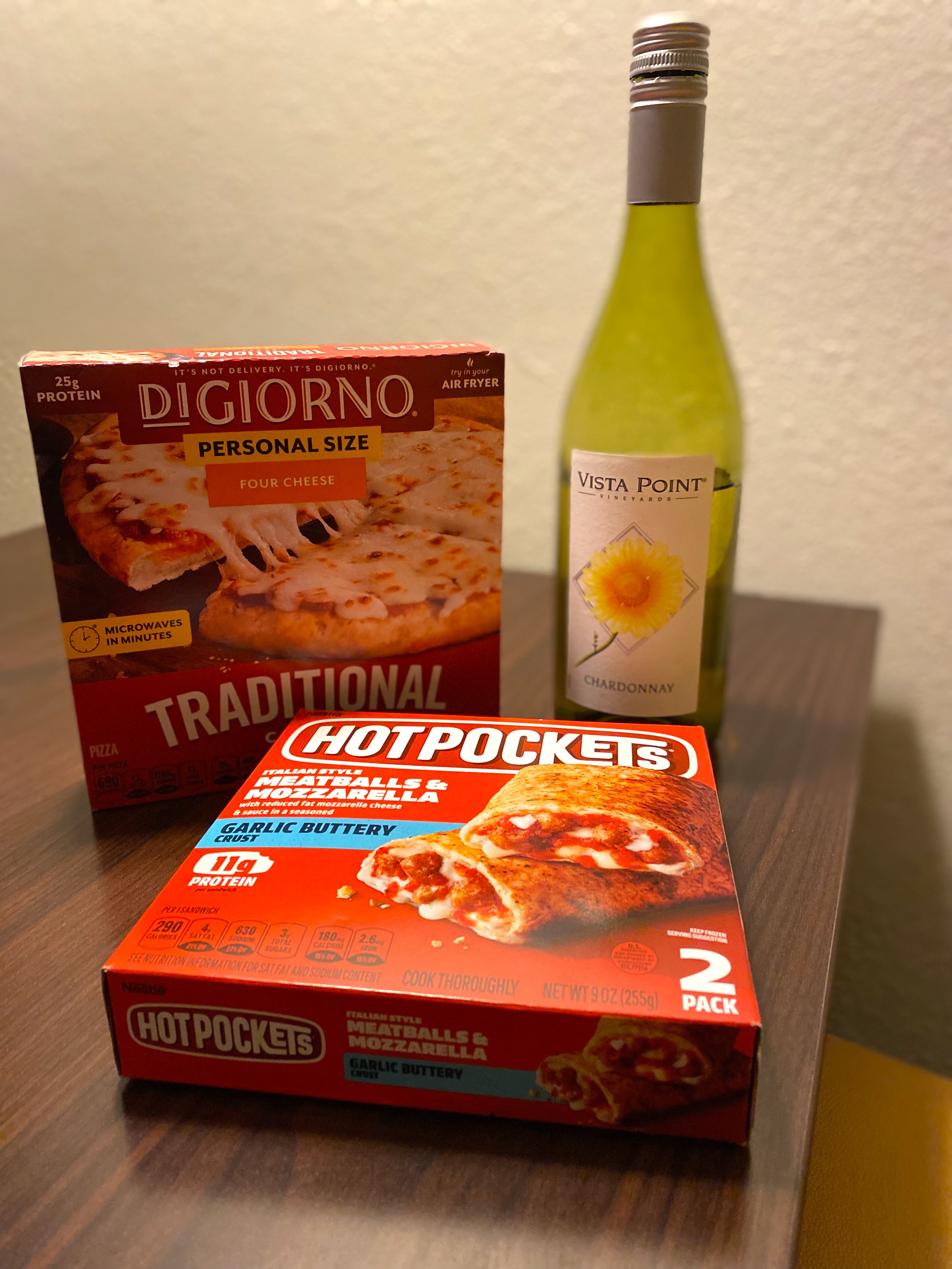 You see, our holiday travels to visit her family just outside Cleveland was a comedy of errors, beginning with a 4 hour delay at LAX due to no Co-Pilot for the plane, then a Detroit rental car with a flat tire that we frantically raced to fill with enough air to get us back to the rental counter for a new car – which led to a late night drive from Detroit which ended so late that nothing was open except for our hotel “emergency food” shop, which led to this dinner: