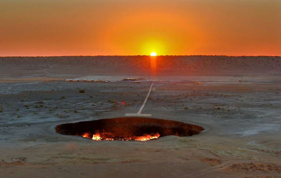 Officially called the Darvaza gas crater, the blazing pit in the middle of the Karakum desert has long been a draw for the few tourists permitted to visit Turkmenistan. About 200 feet wide by some measures and at least 70 feet deep, it cuts a dramatic image against the vast expanse of empty land surrounding it.