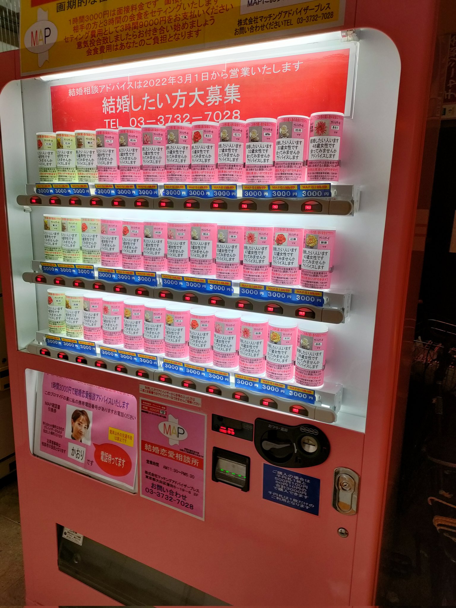 The pink cans represents women seeking companionship, and the beige ones men, each with the individual’s age written on it. The vending machine isn’t anything so vulgar as an anonymous hook-up provider, though, as its inventory is stocked and managed by Matching Advisor Press (which also goes by the acronym MAP), a matchmaking service for singles actively seeking a serious relationship that will hopefully lead to marriage, or konkatsu, as it’s called in Japanese.