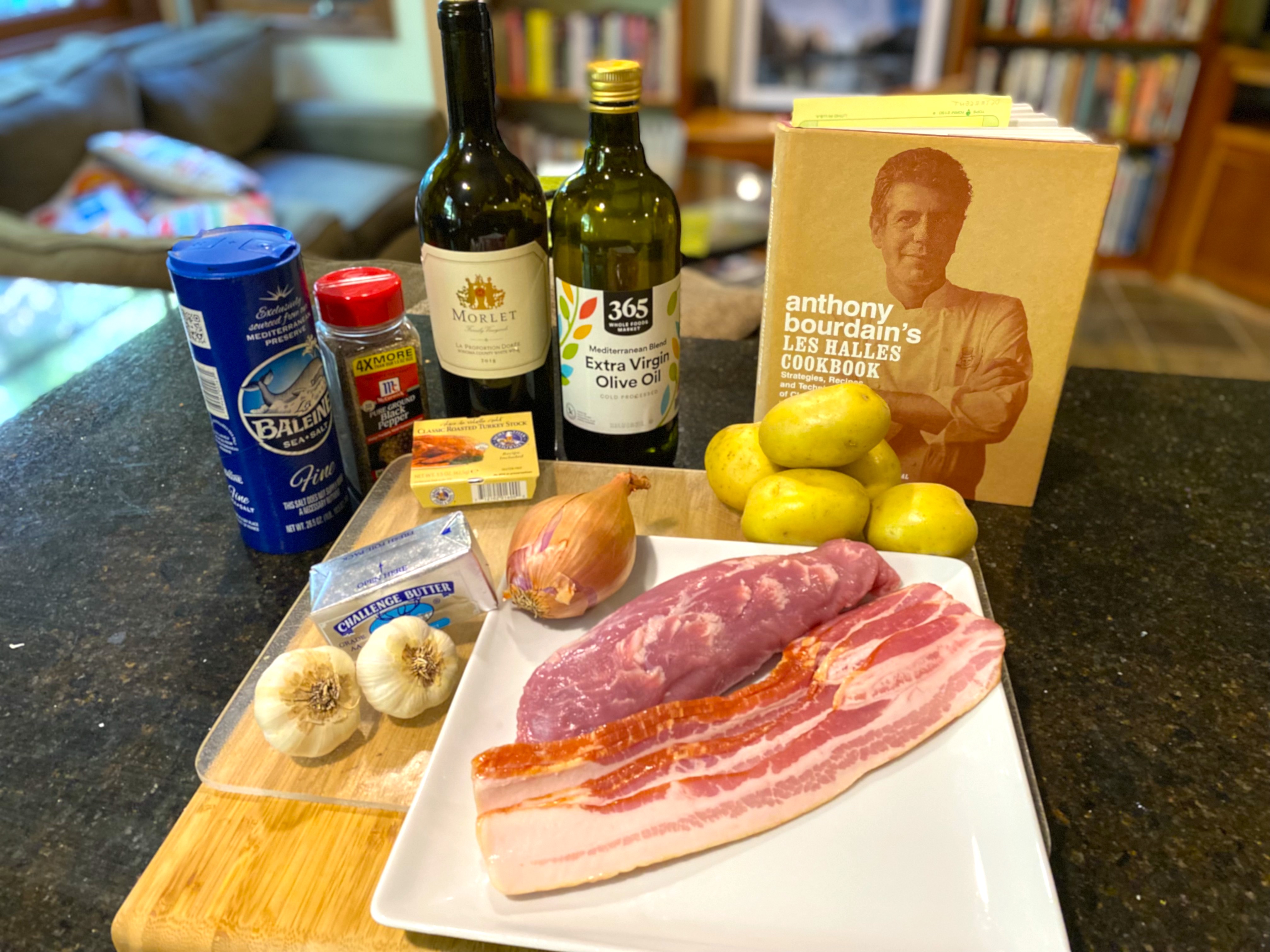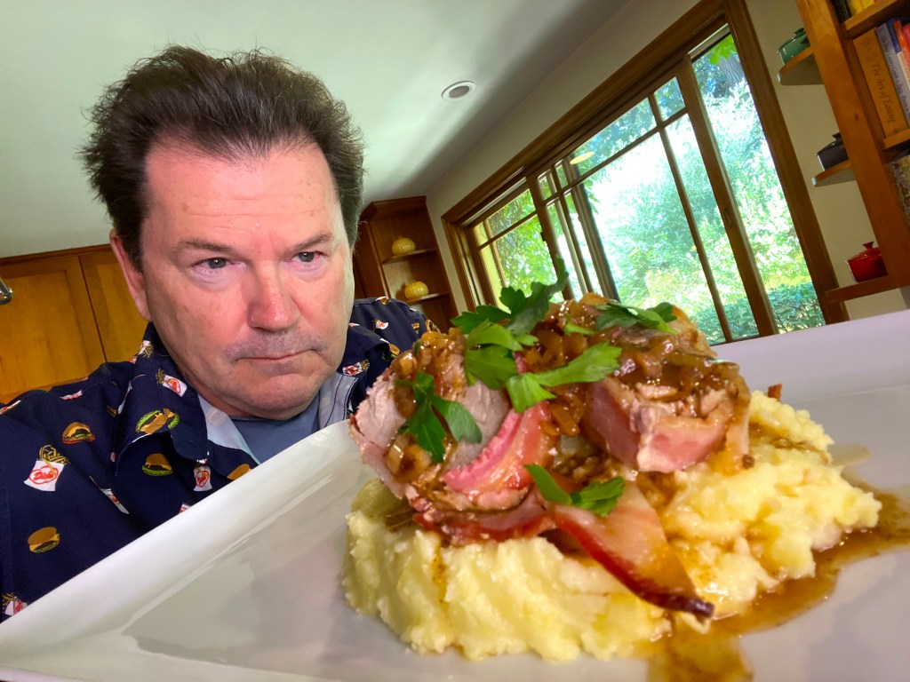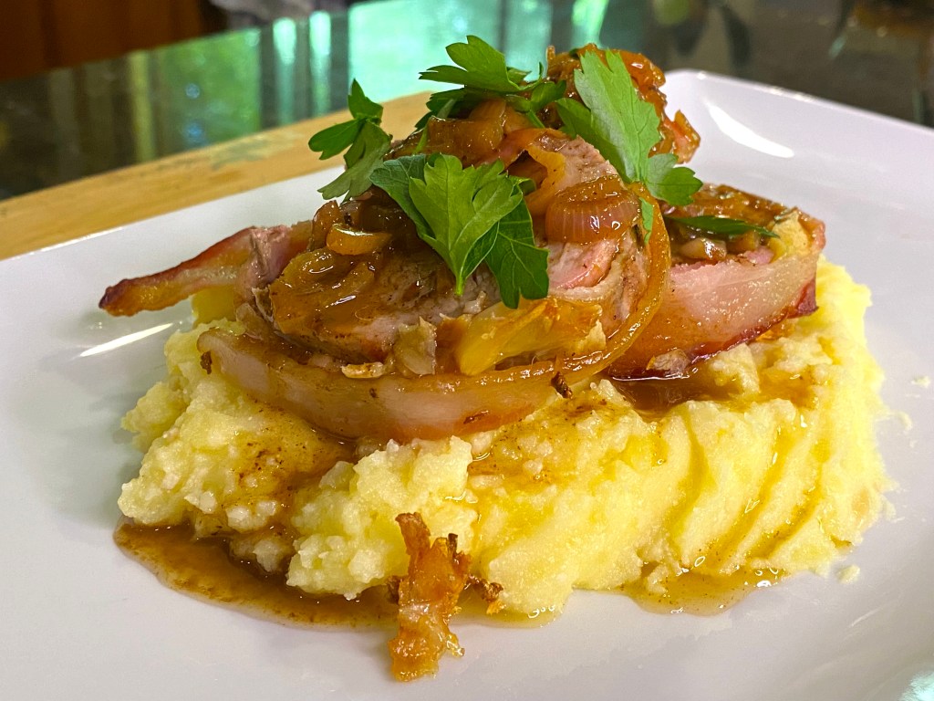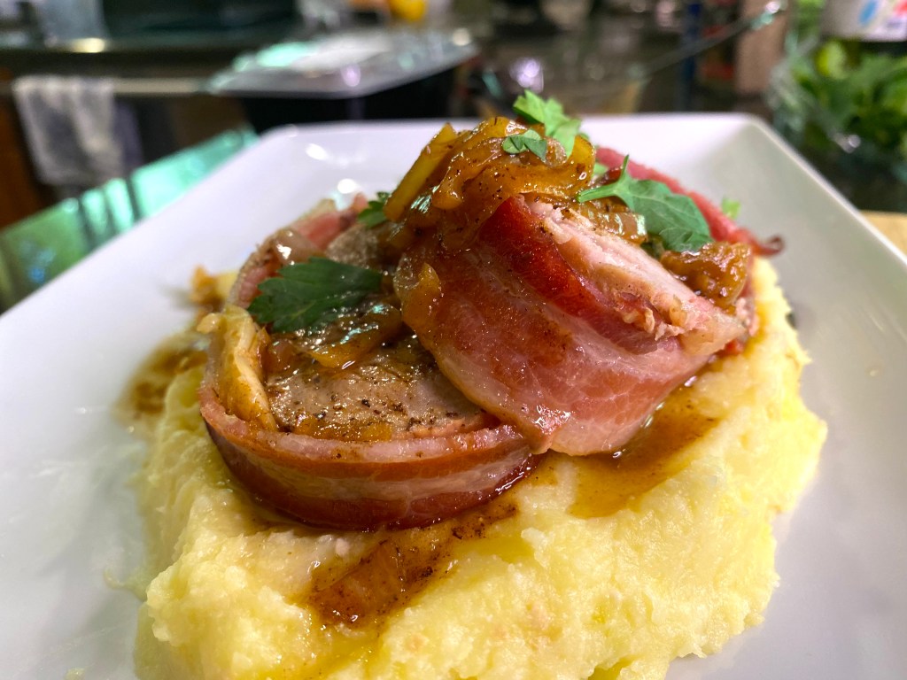 There it is: Anthony Bourdain’s bacon-wrapped garlic stuffed pork tenderloin with shallot sauce over garlic mashed potatoes!