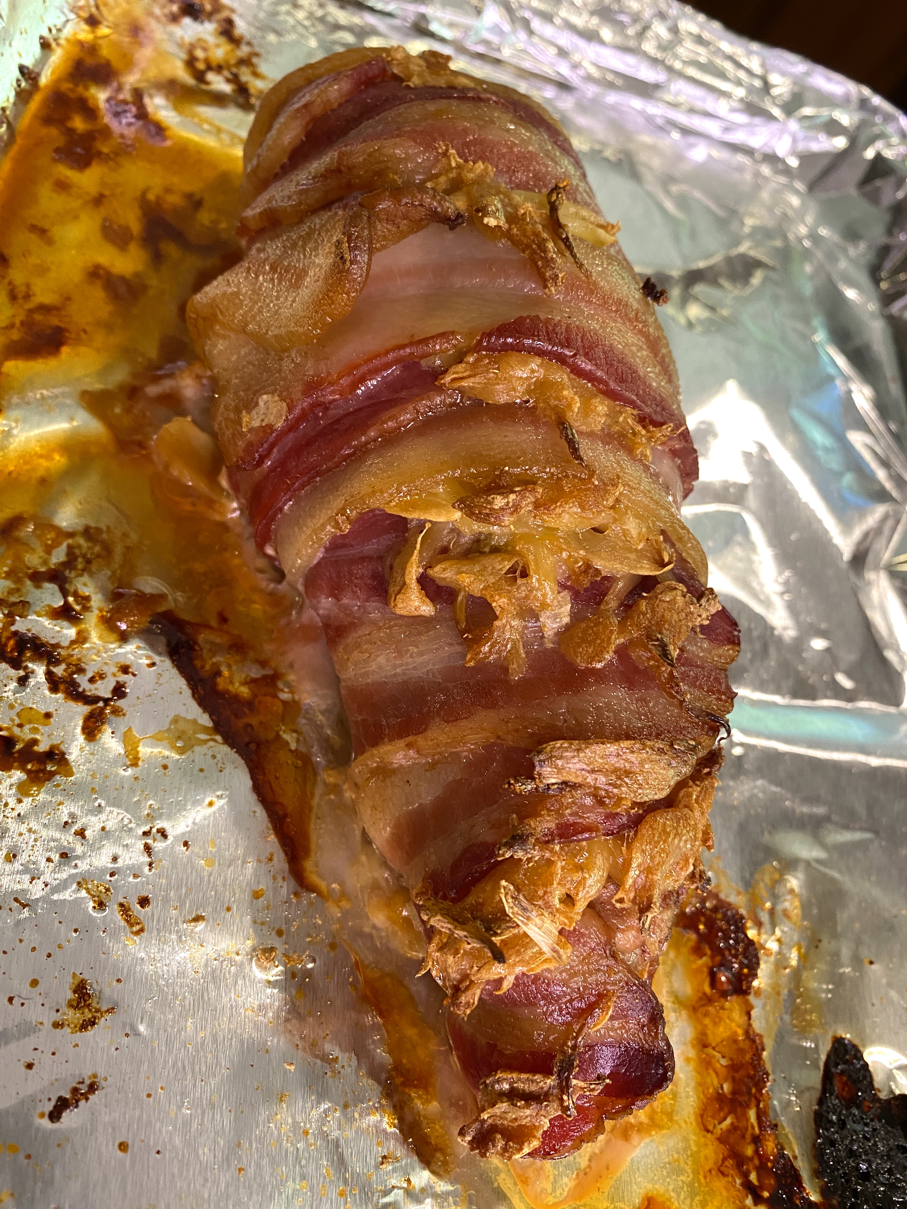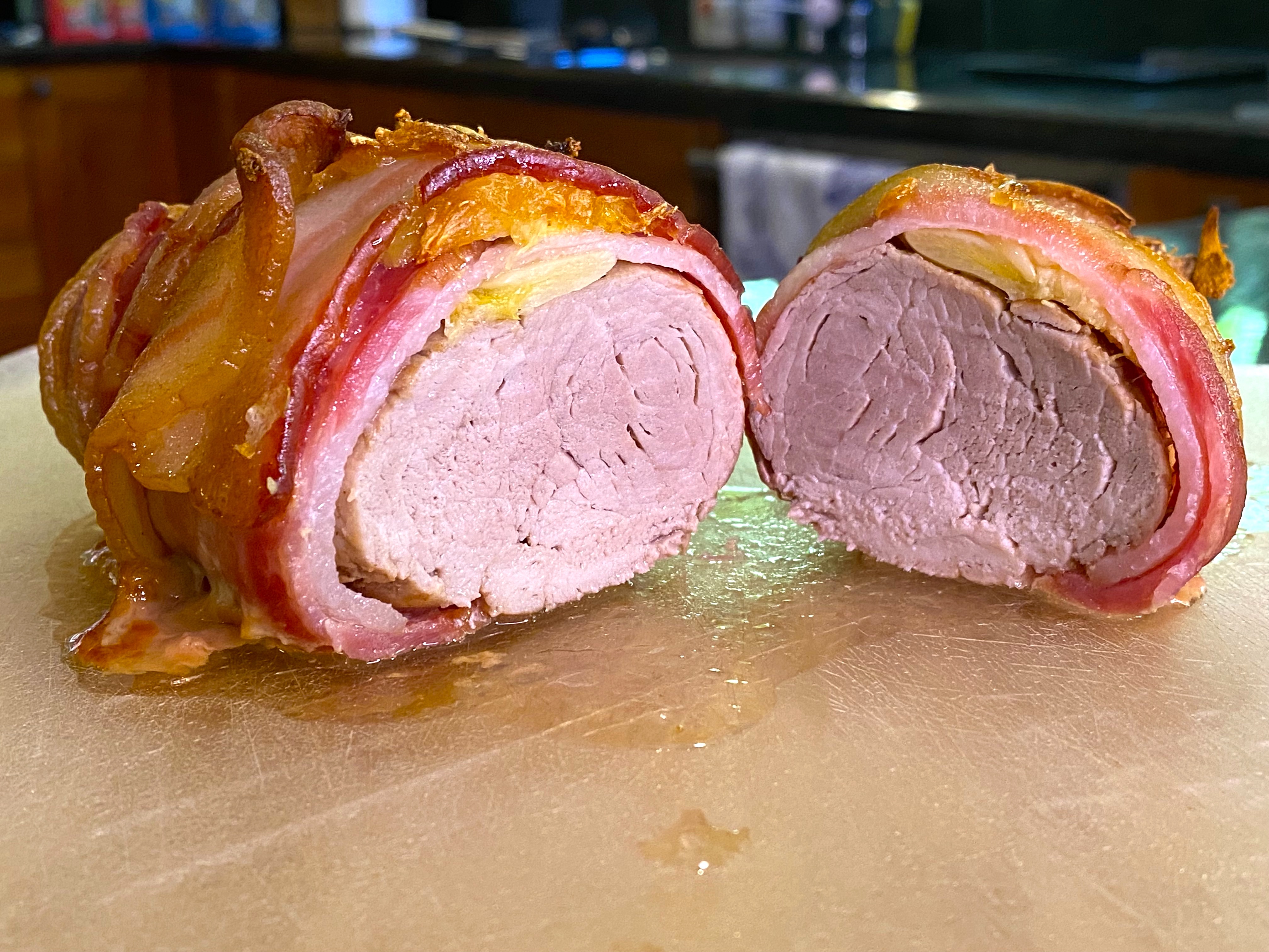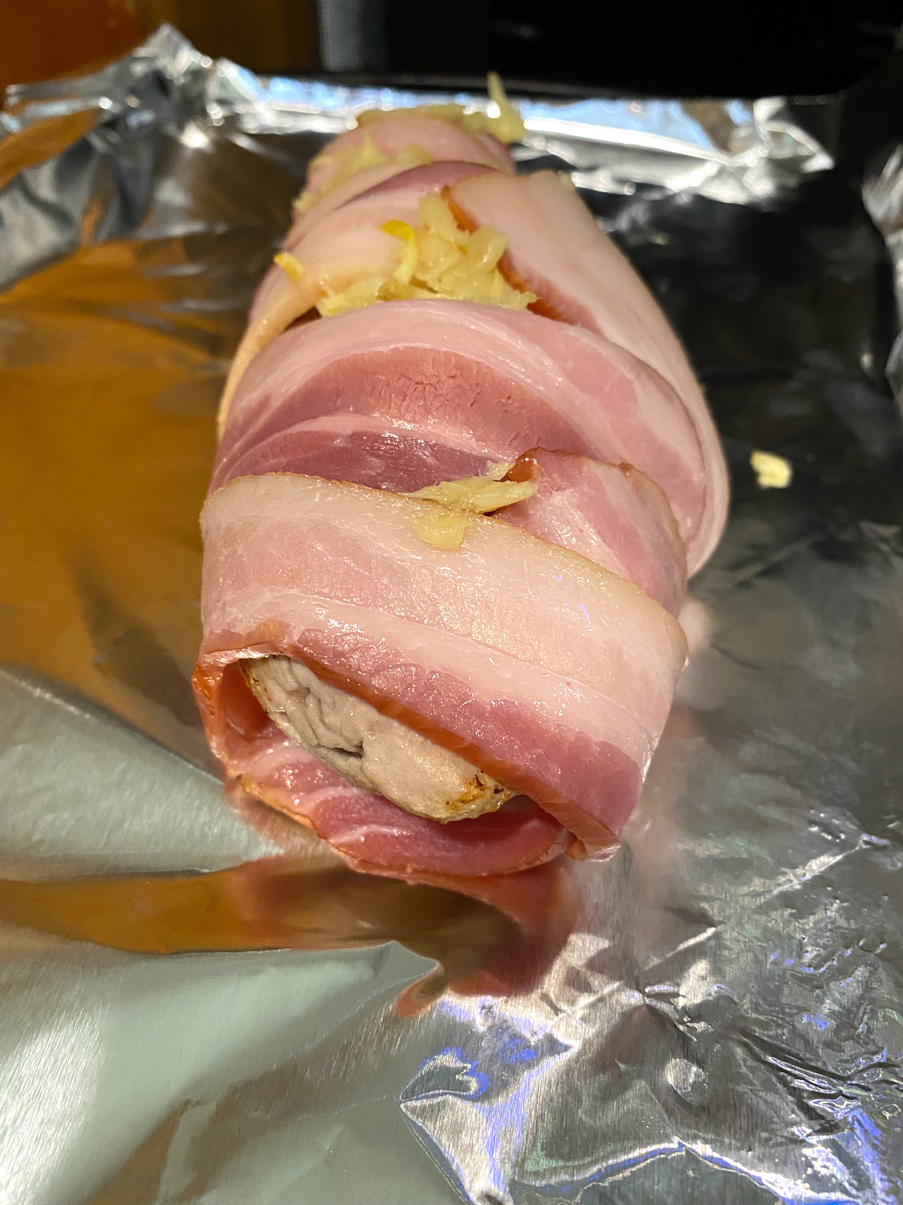 “Bacon-wrapped” anything is going to be delicious, and the key here is to wrap the tenderloin with the bacon overlapping…of course, I forgot to put my garlic confit on top like Chef said to, so after I wrapped, I went back and stuffed it with the confit like so: