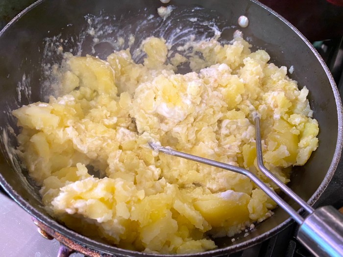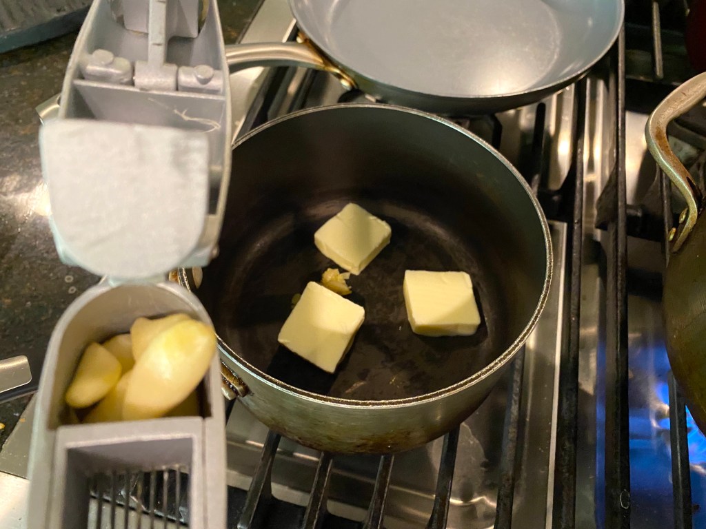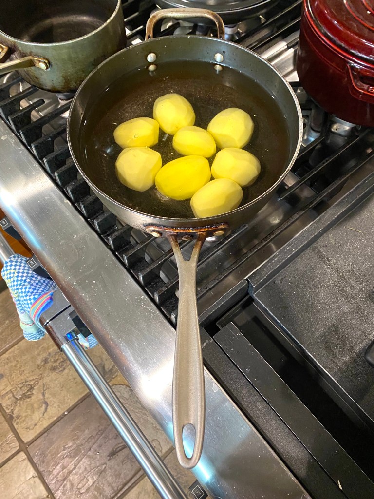Of course, one of the least interesting aspects of cooking is boiling potatoes after skinning them, but here they are anyway and the two important additions to them: