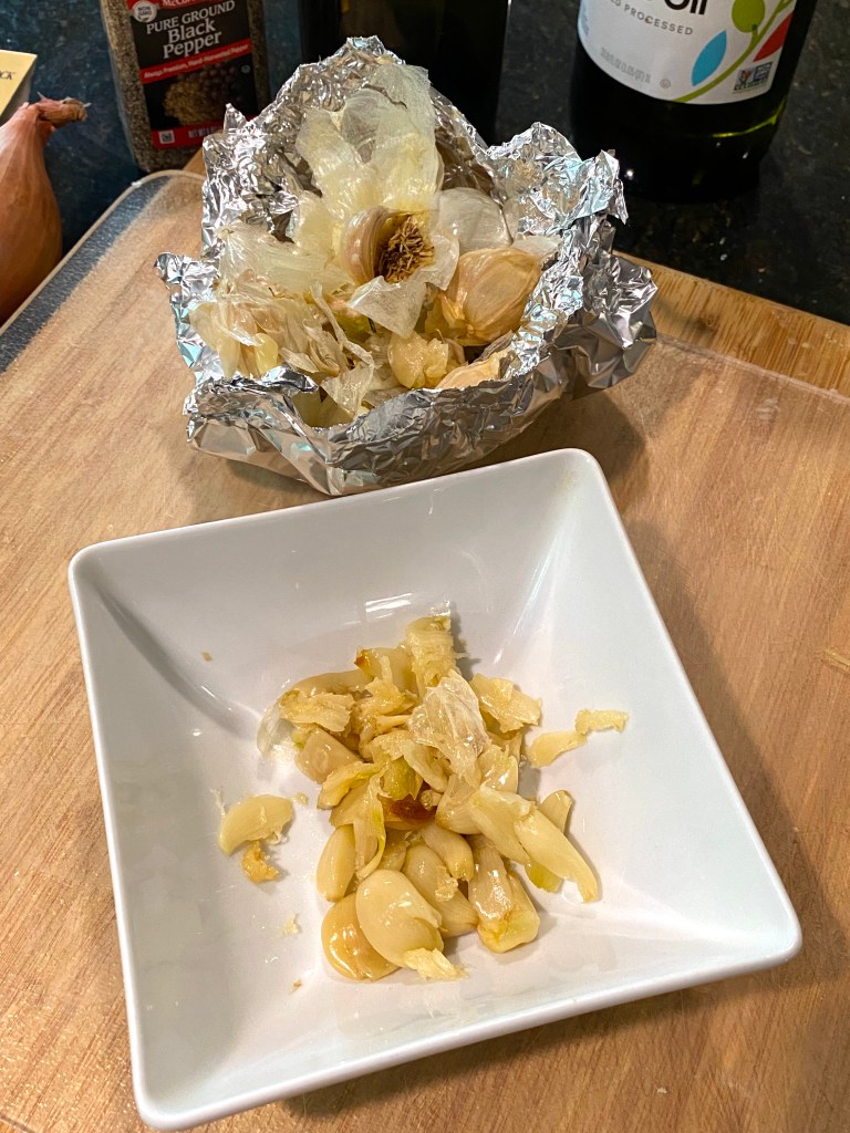 A half hour later, remove them from he oven, let cool and then squeeze the garlic out of the husks and set aside…oh by the way, this ensures the rest of your cooking is done with this delicious fragrance in your kitchen!