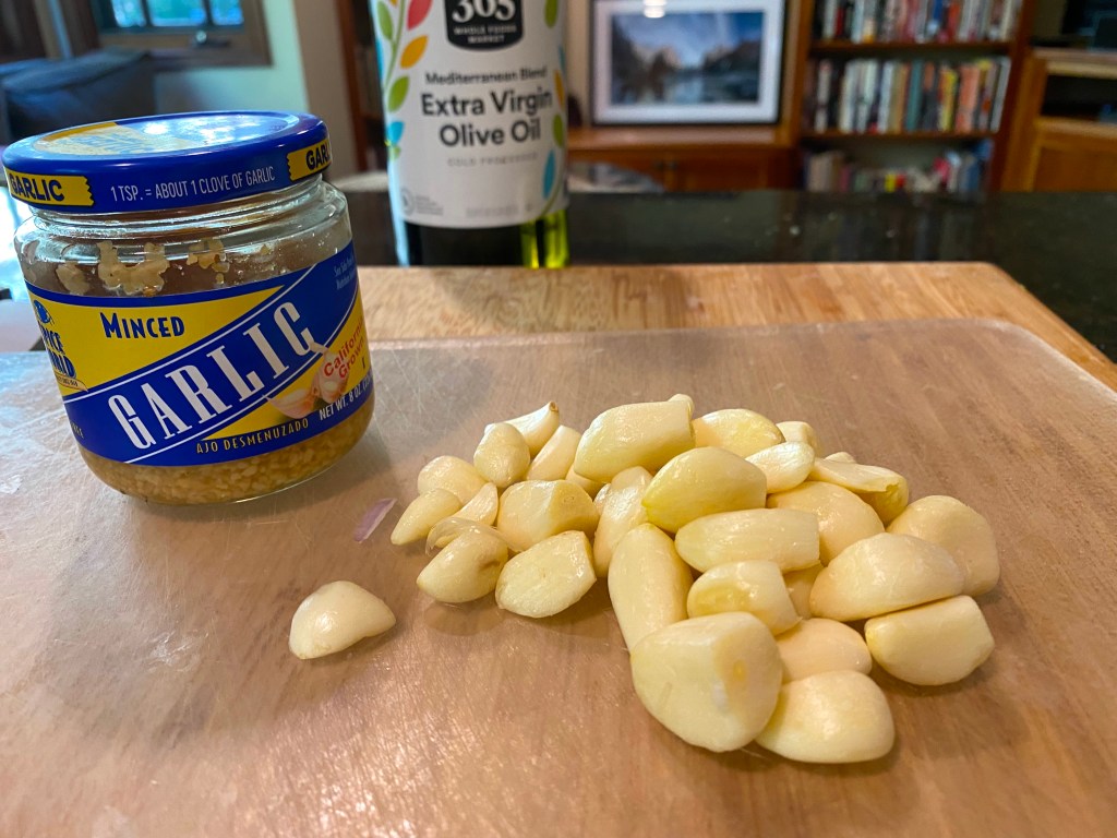 Here are the ingredients: there aren’t that many really, but we will be serving our “bacon-wrapped garlic pork medallions” over mashed potatoes as recommended by the Chef – and let’s begin the recipe by making some garlic confit!
