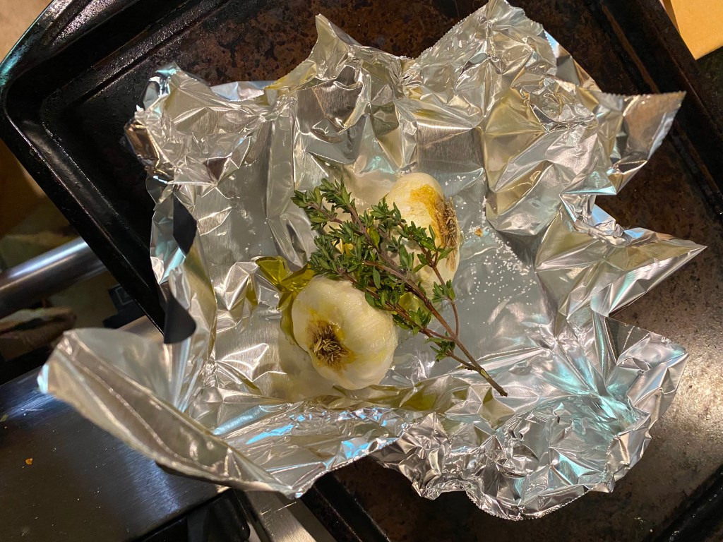 It’s very simple: heat your oven to 350 degrees, put two whole garlic bulbs in some tin foil, drizzle with olive oil and add a sprig of fresh thyme: