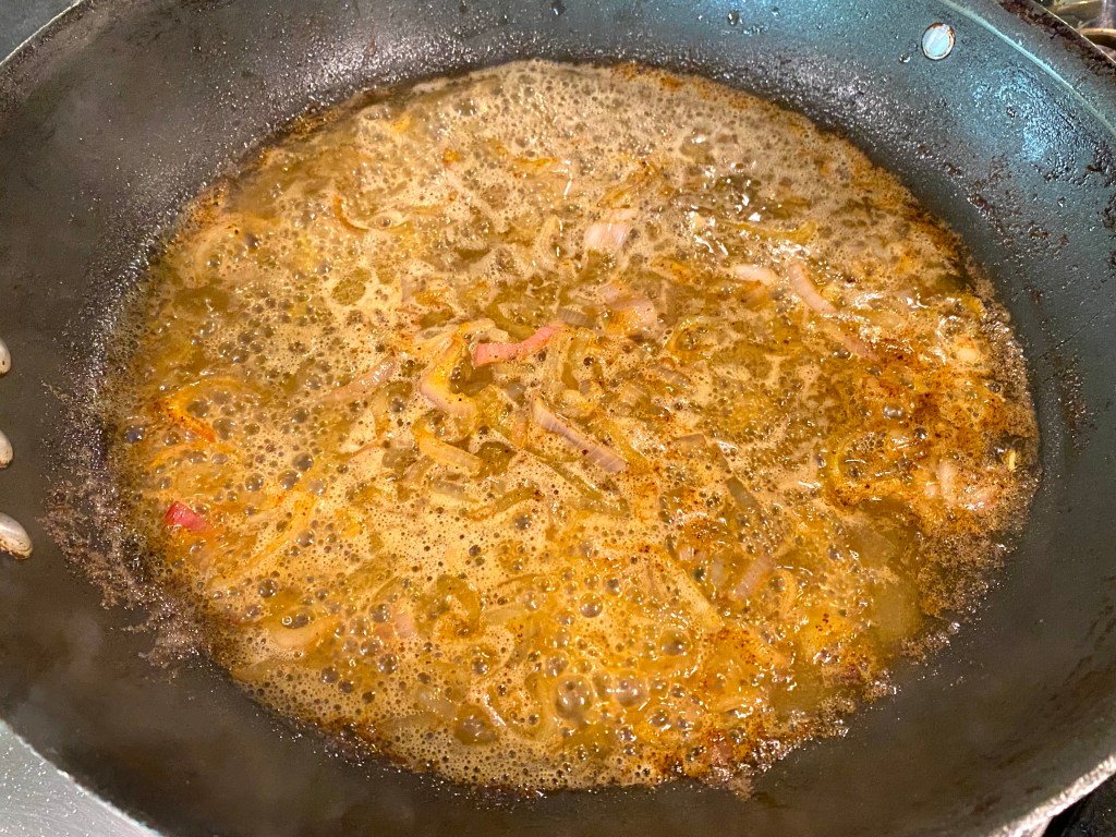 The recipe called for a quarter cup of white wine but I used a bit more, and you reduce it by half…now, Chef also recommends you take any drippings from the pork in the oven and put it in the sauce as well….after cooking down, you have your delicious smelling sauce here: