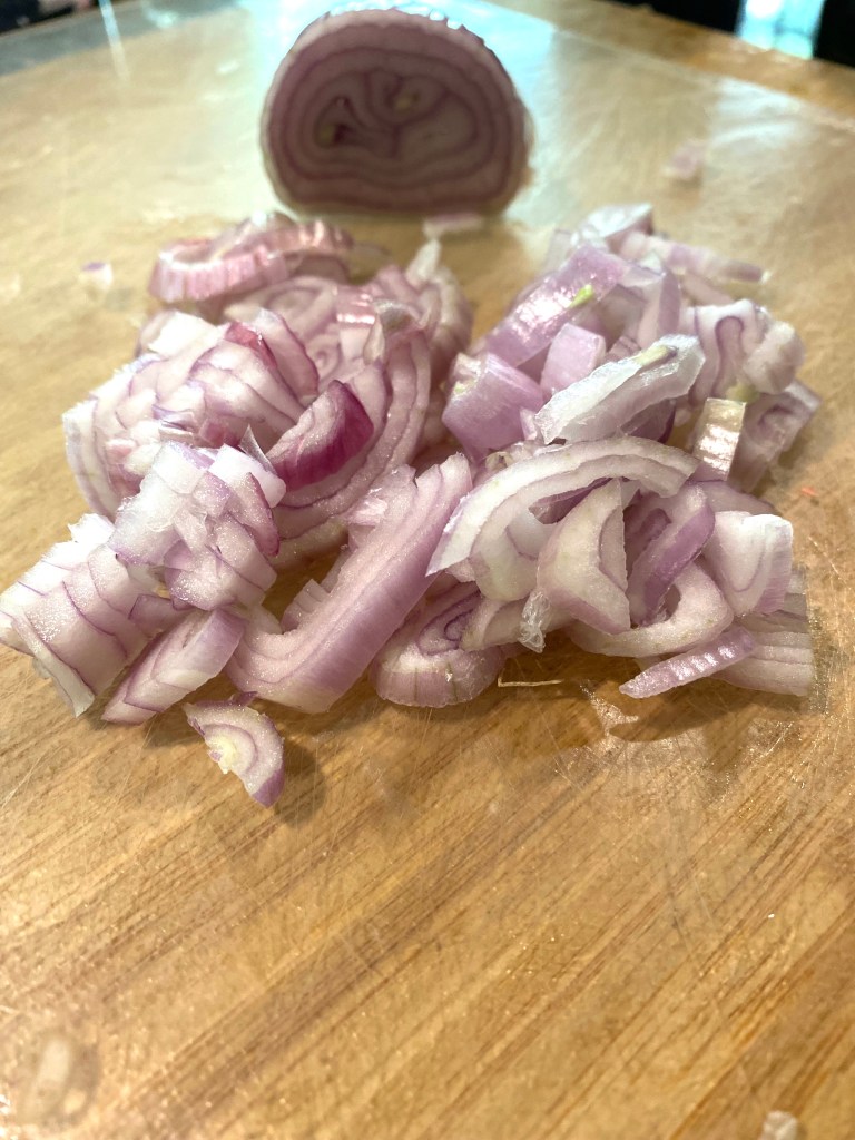 Next up, Bourdain says to remove the old oil/butter and add two tablespoons more, but I kept all of that great oil and butter in the pan and added two thinly sliced shallots over medium heat, which brought the kitchen to noisy life again: