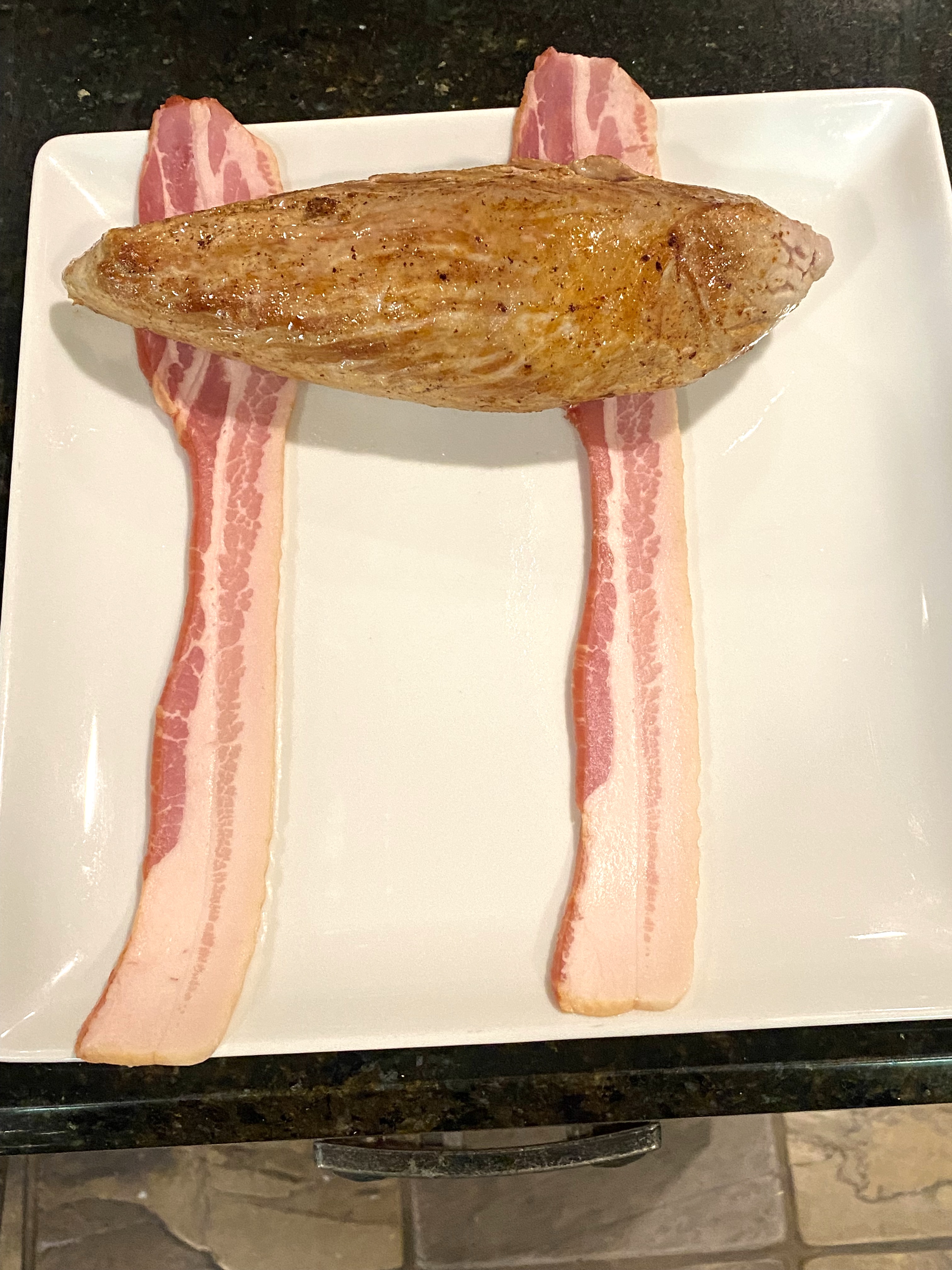 Chef says to sear your 10-12 ounce pork tenderloins over medium high heat in a bit of olive oil and two tablespoons of butter….you want it seared on the outside, so I did it for 5-6 minutes before turning it – when done, I set mine on top of two slices of raw bacon like so: