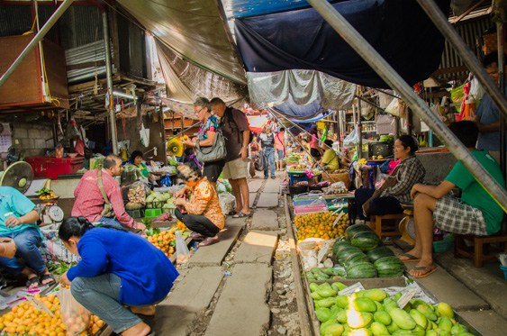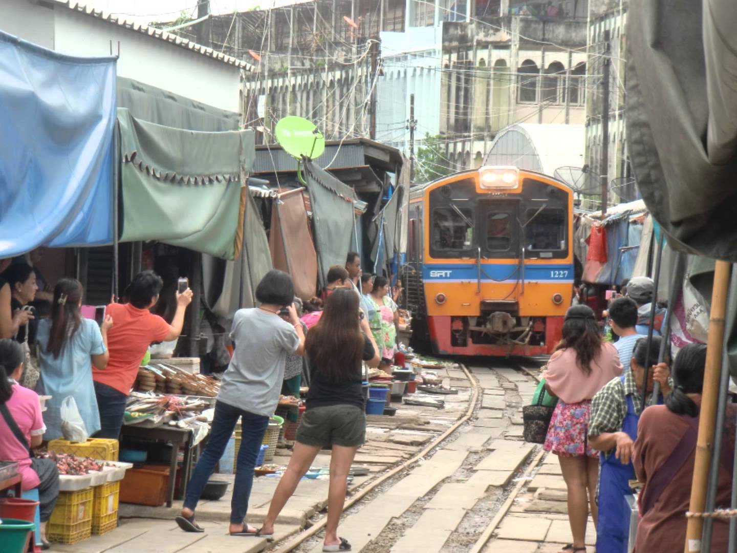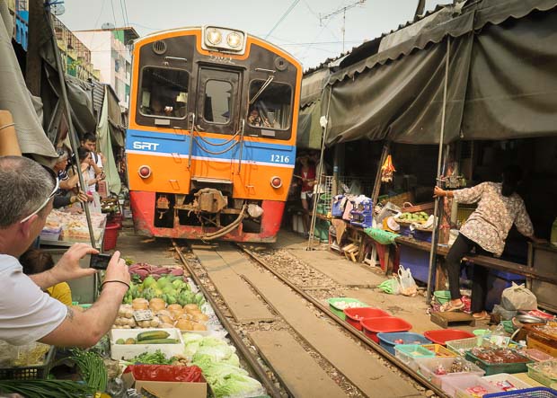 It’s a great seafood and vegetable market located about an hour outside of Bangkok, known as the Maeklong Railway Market, because – well, whenever the market stalls are open for business, they block the rails of a working railroad!