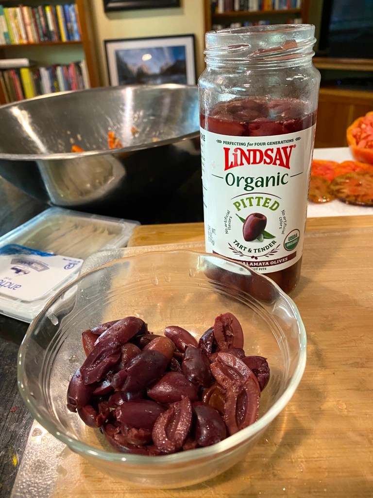 Once the hard-boiled eggs are sliced, do the same with your Kalamata Olives – I do them lengthwise as well, and unpack your Marinated Anchovies: