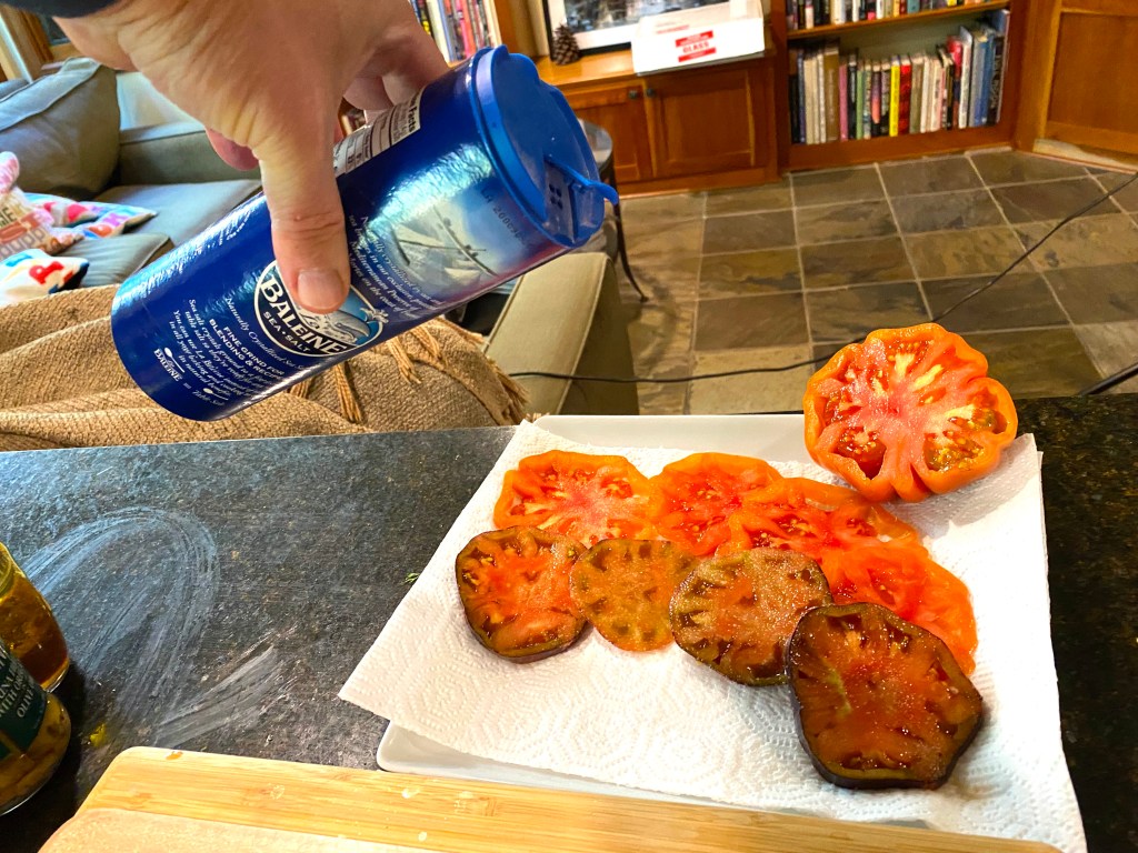 Patricia is clear about two things: first, wrap the sandwich in tin foil and put it in the refrigerator, with a heavy object pressing down on it…that will help the bread absorb the oil in the tuna!