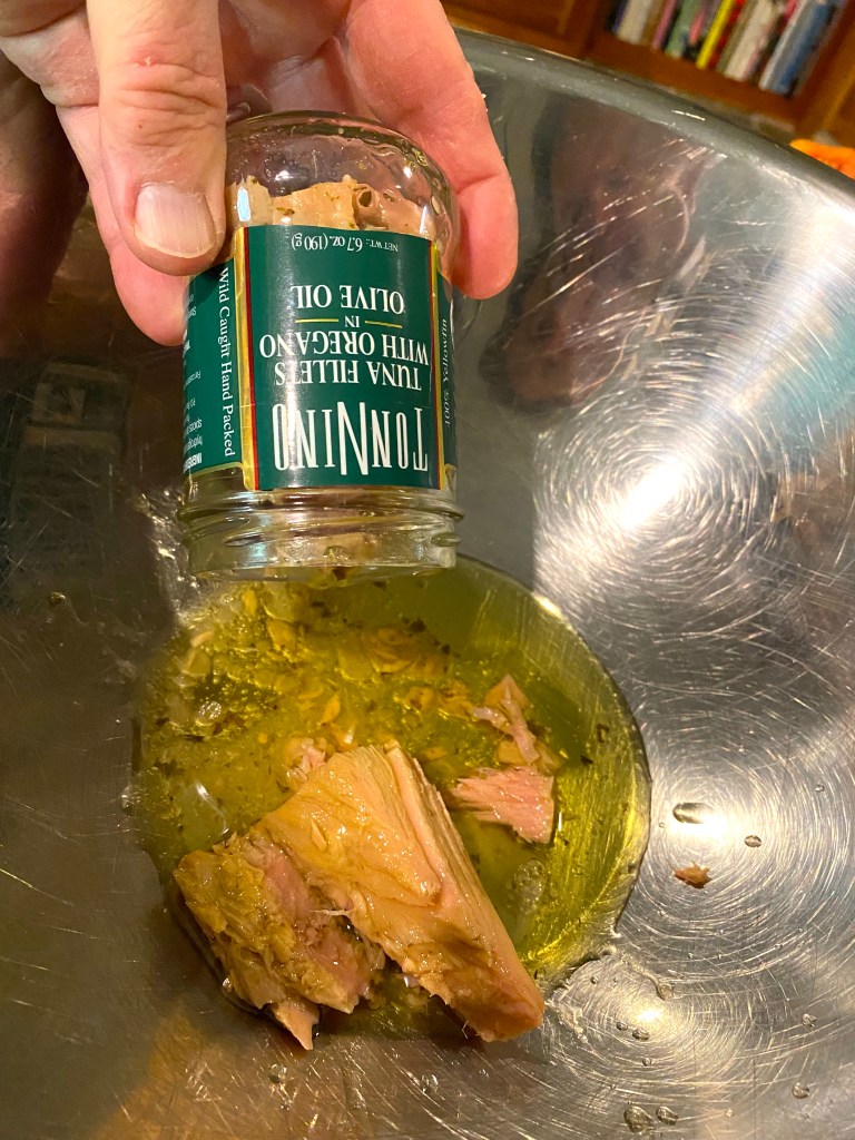 Next, I put two glass jars of Tuna fillets in a bowl – and very important: you want the Tuna that is packed in oil, as that is an important part of the recipe – remember, we are going to “bathe”!