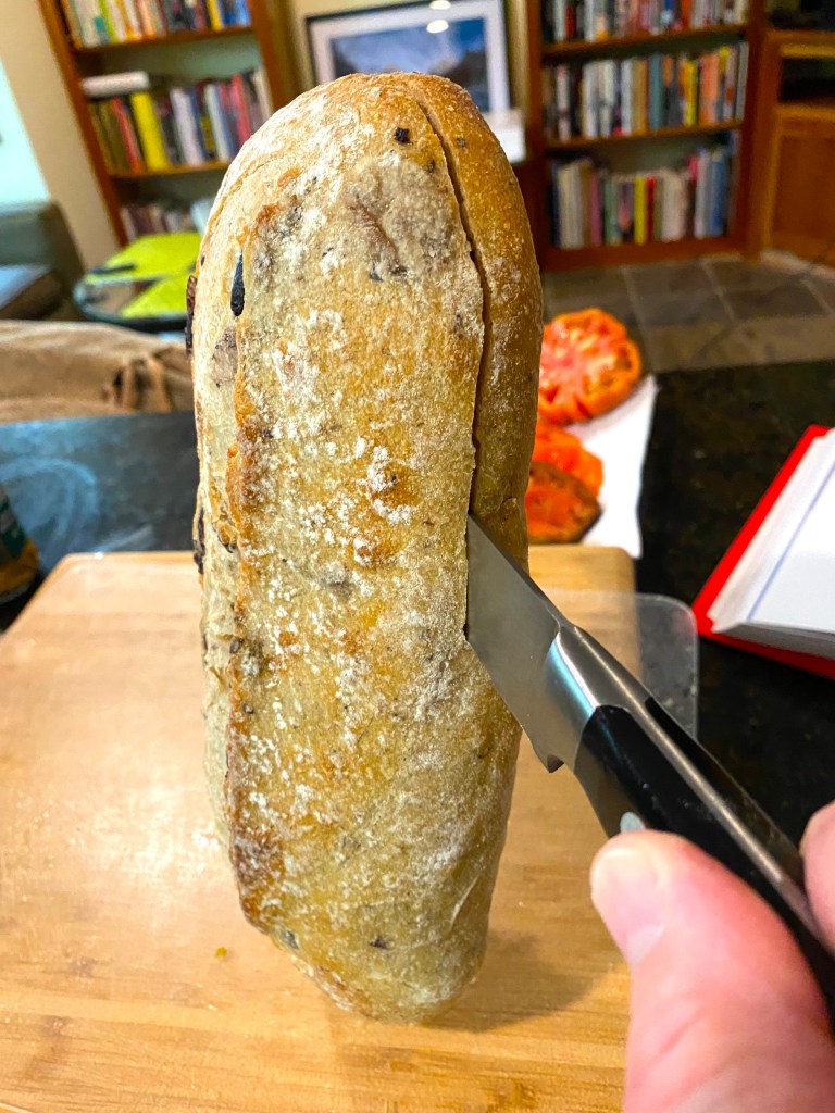 The best bread is a Baguette, with a filling soft enough that the ingredients will indeed “bathe” it…and the process begins by slicing the loaf lengthwise…