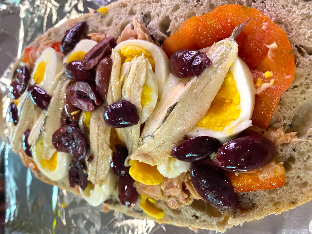 This colorful sandwich feel like the south of France, with the bright yellow egg yolk, the red bell pepper, kalamata olives the color of a great provencal red wine, and the freshness of the tuna and anchovies give it the taste of the sea…