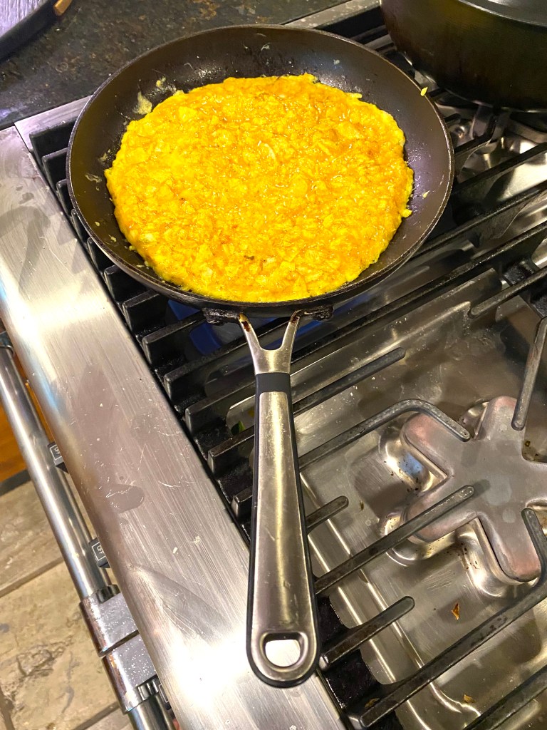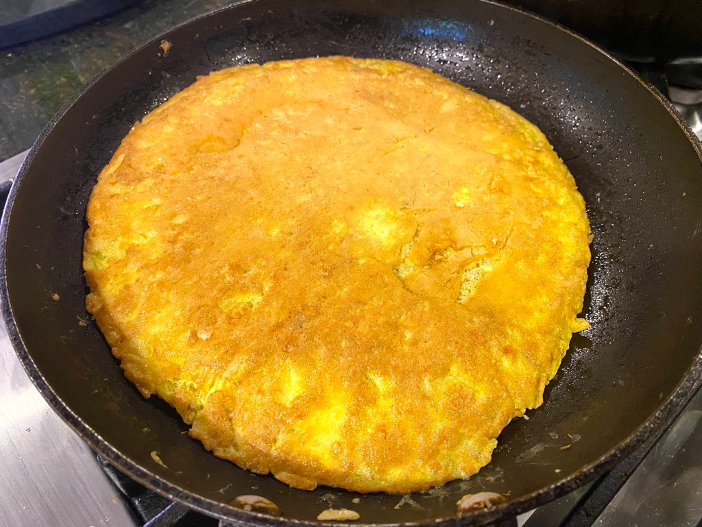 After about 4 minutes on medium heat, I flipped the “tortilla de potata” over in the pan and let it cook for another minutes:
