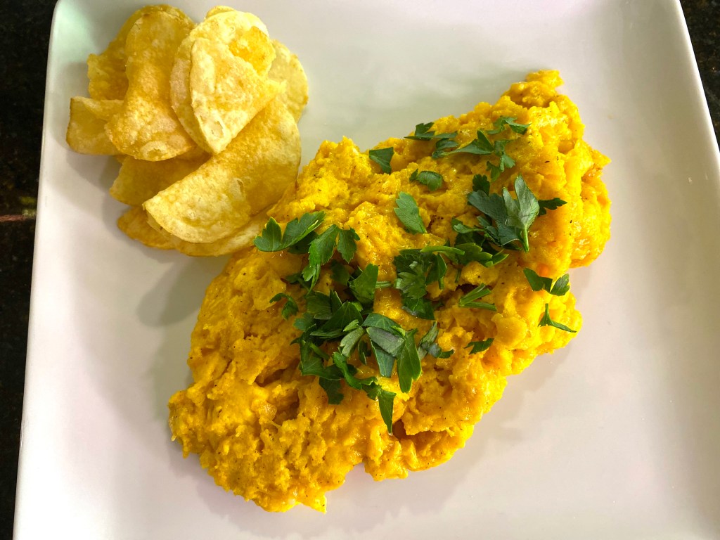I really didn’t like the way the chives looked on the frittata, so this time I plated the slowly scrambled eggs with a side of potato chips and topped them with parsley…and here’s how it looked: