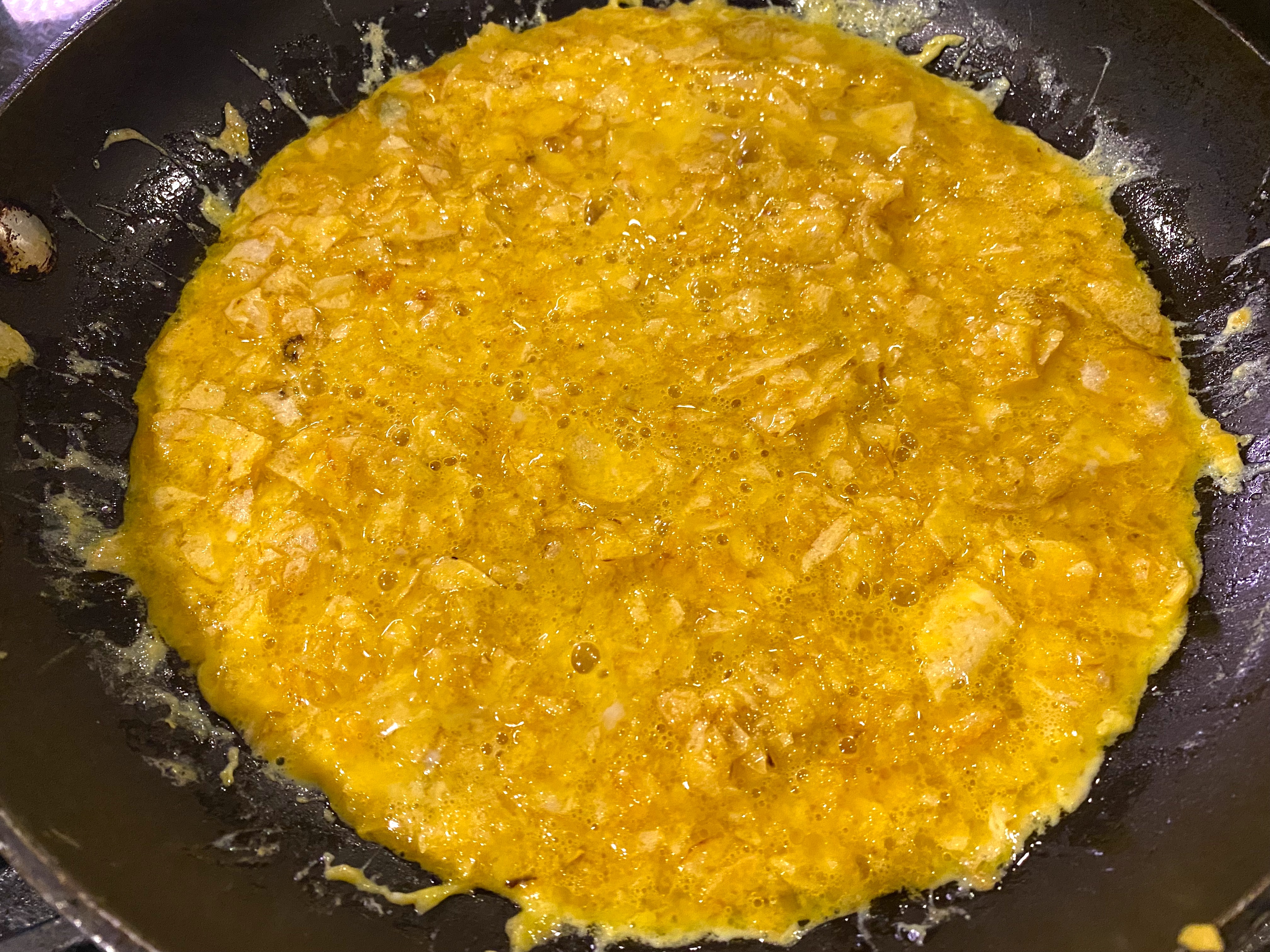 I put the whisked eggs in a pan that was lightly oiled, then added the potato chips and mixed them in – more on this later I added the chips once the eggs were already in the frying pan!