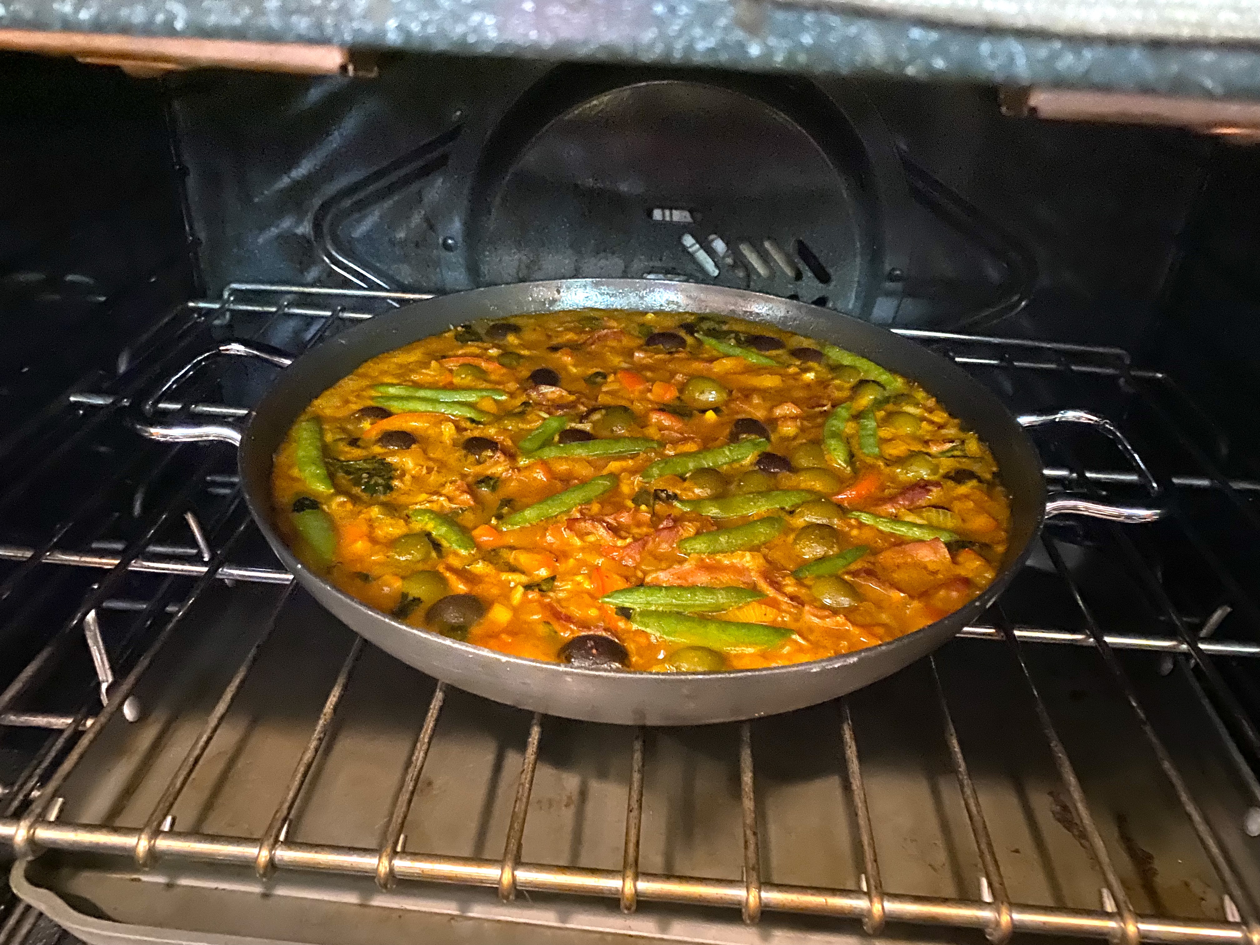 One you put the Paella in the oven, it only takes 18-20 minutes before the saffron chicken stock has been absorbed and the rice is cooked, and it looks gorgeous!
