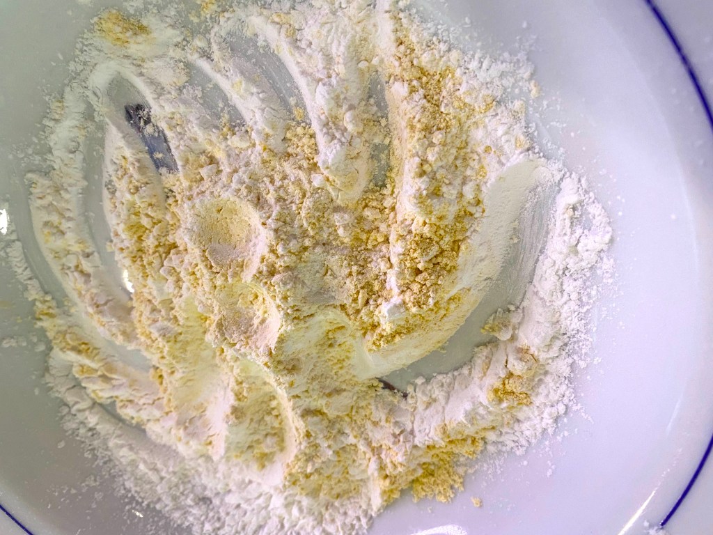 You mix 1/2 cup of white flour with 1/2 cup cornmeal, a nice mix that gives a bit of extra “hold” to the fish, without using an egg wash…and this doesn’t have to be unhealthy…I fry my fish in olive oil!