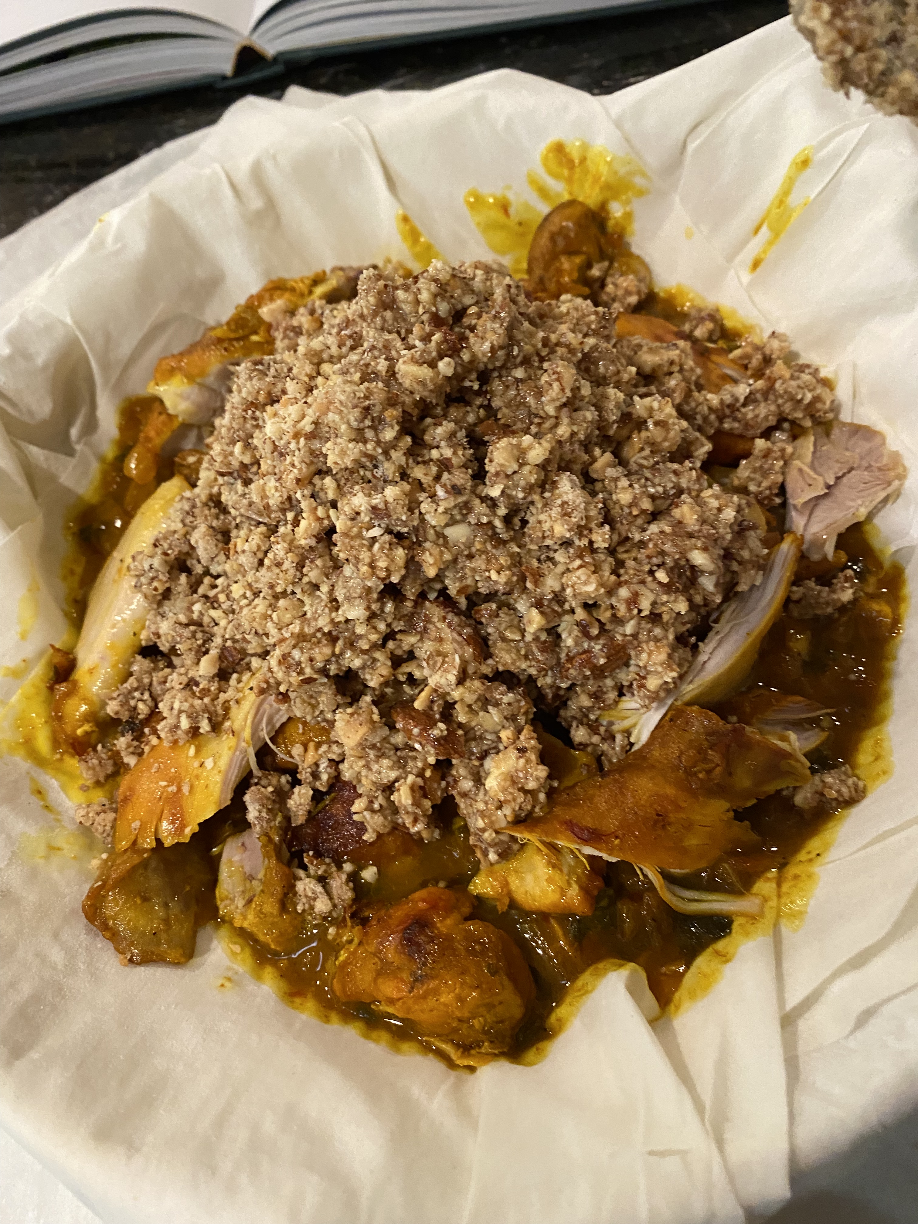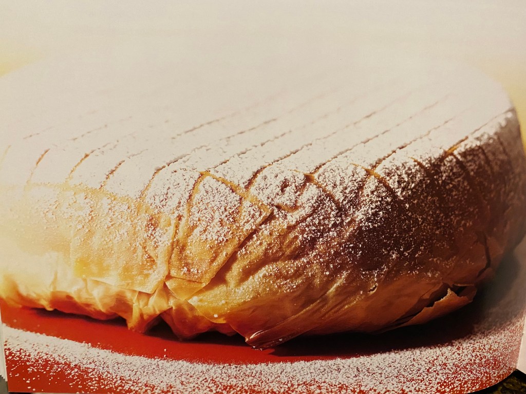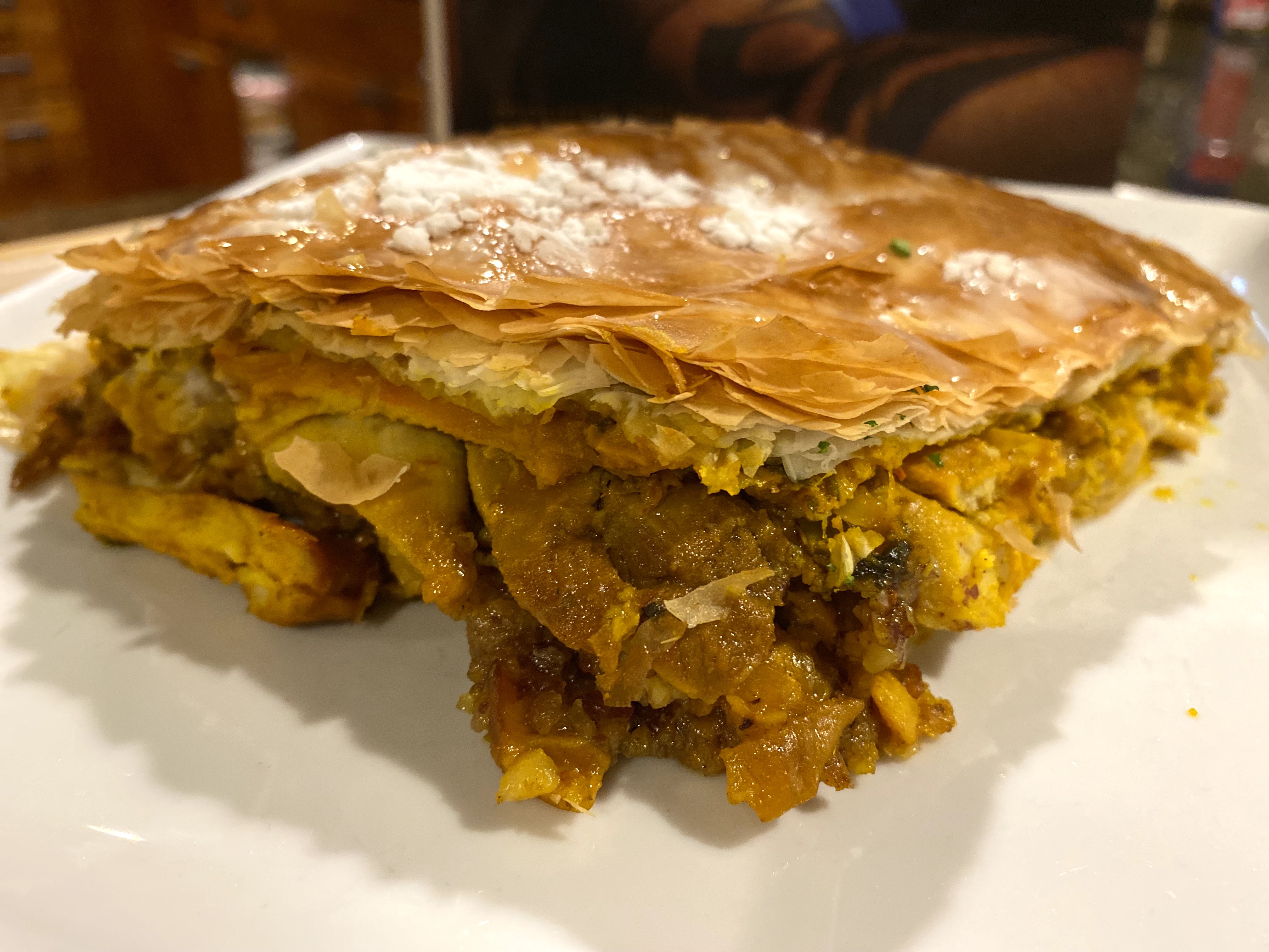 “On paper, this dish sounds odd, because it’s so sweet and so savory. You’ve got saffron-and-spice-braised chicken, lots of cinnamon-sugar toasted almonds perfumed with orange blossom water, and offs scrambled in the braising liquid, all layers inside a shell of flaky pastry and topped with powdered sugar and cinnamon.”