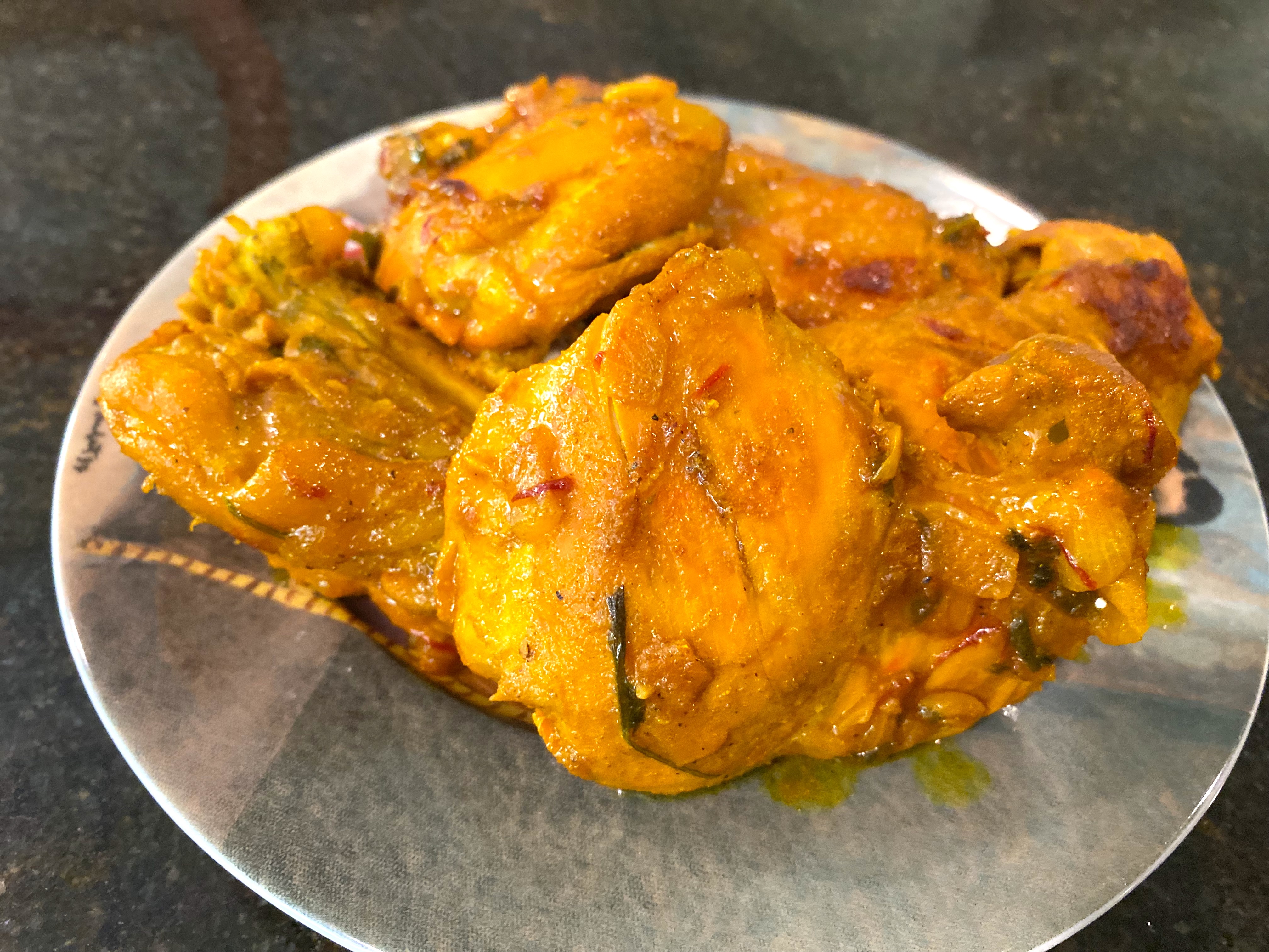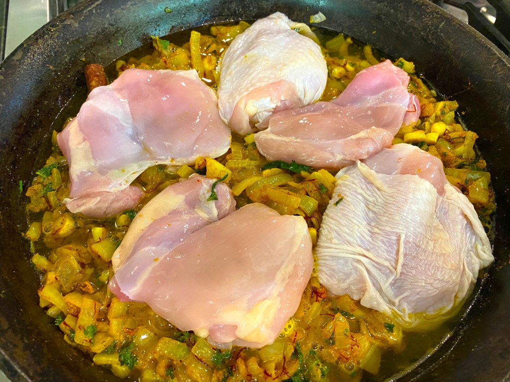 I moved the pieces every ten minutes, turning them over and letting the spices infuse the chicken…see those saffron threads slinging to the chicken? When cooked, take the chicken pieces out and set aside.