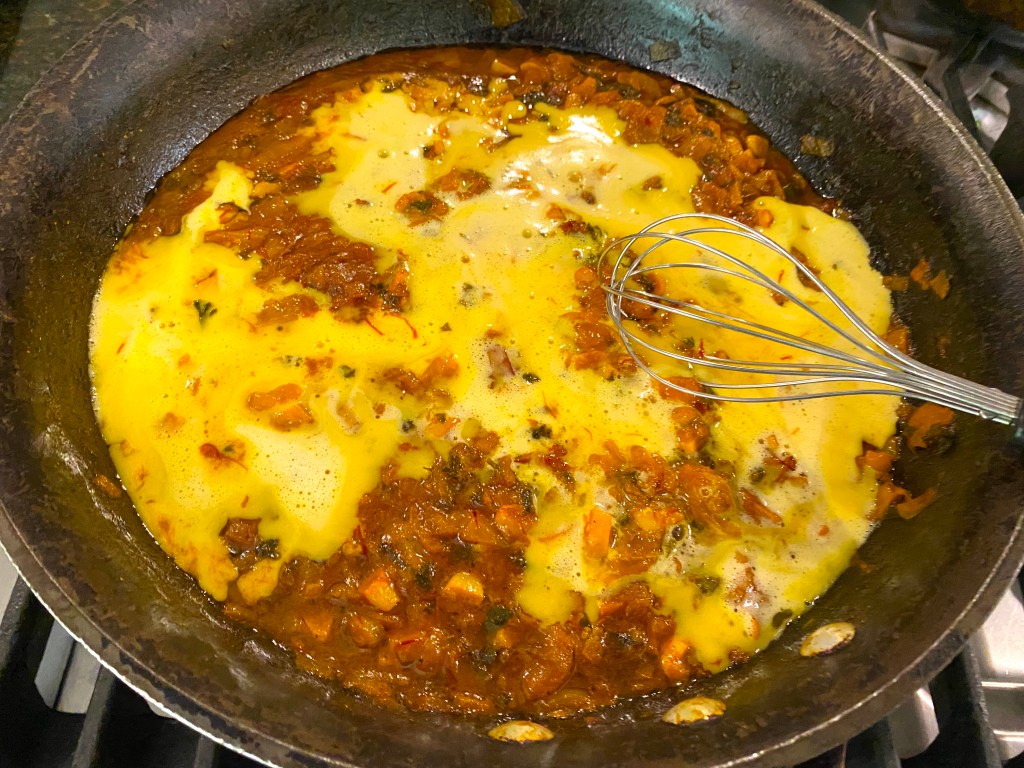 After turning on your oven, simmer the onion spice sauce that you just cooked the chicken in, letting it reduce a bit and use an immersion blender to mix four large eggs: