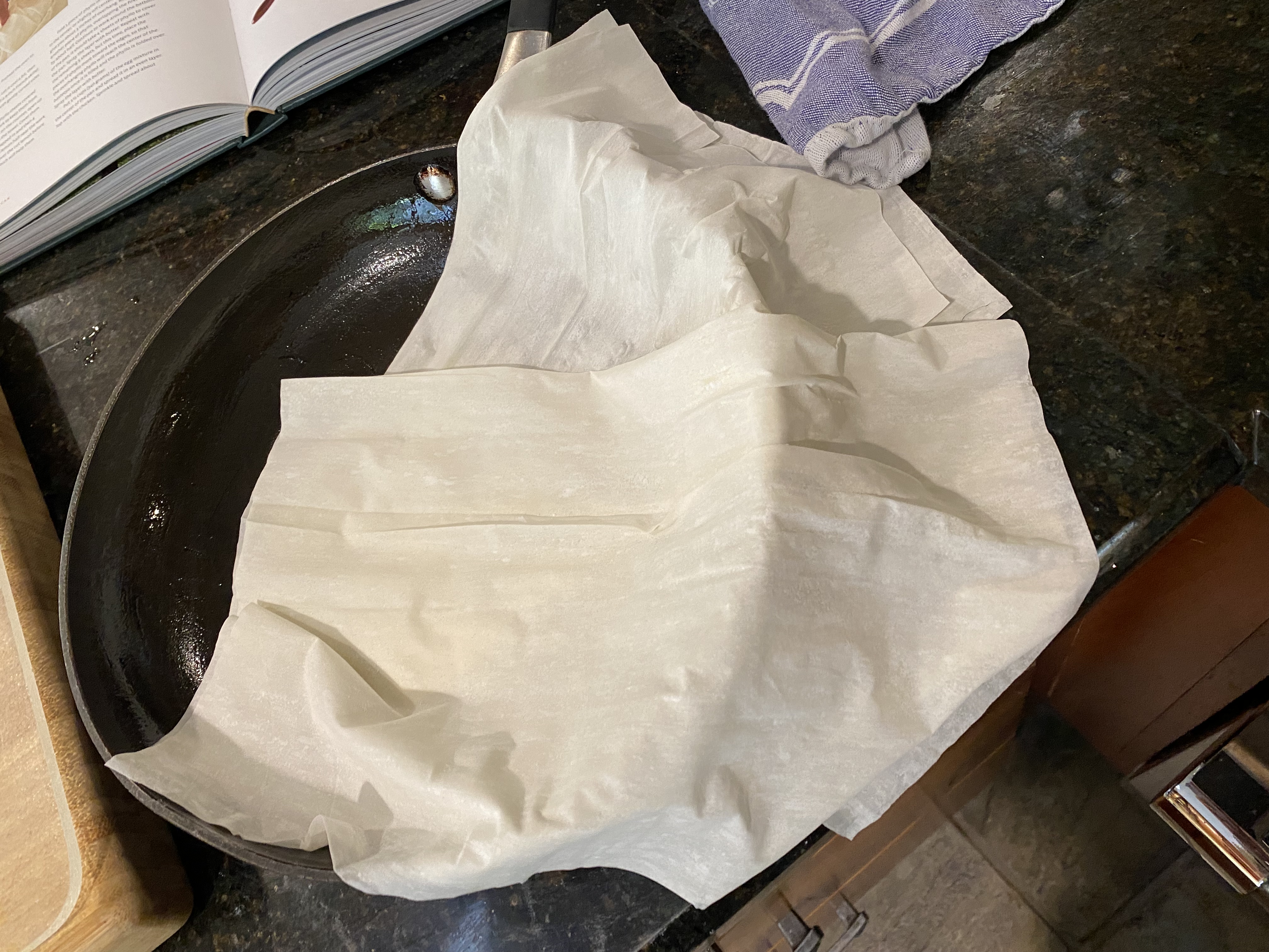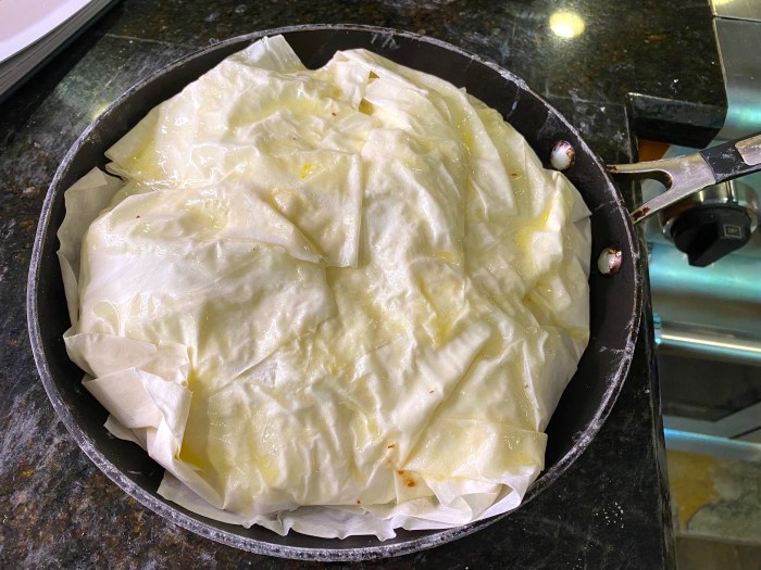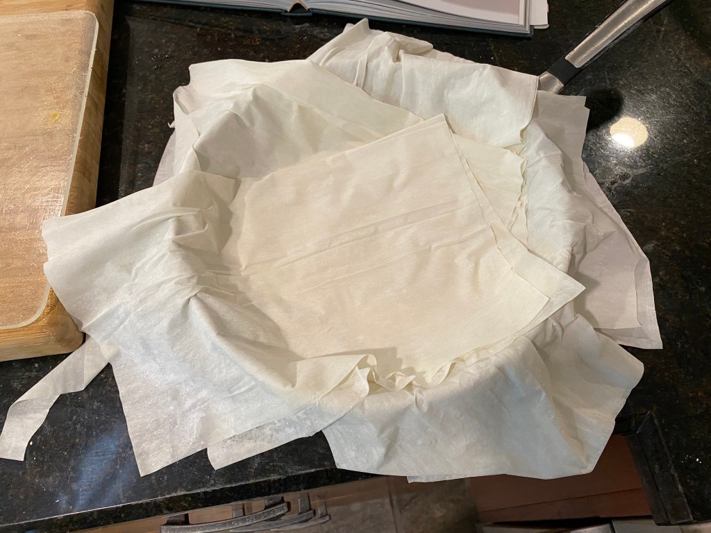Lay a folded sheet of Phyllo slightly off-center of the pan, with about 3 inches of overhang…do it again – it should take 4 sheets to completely encase the bottom like this: