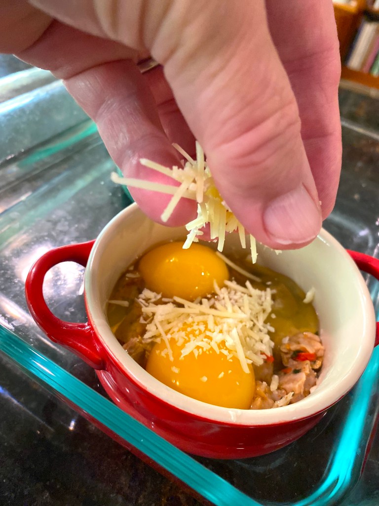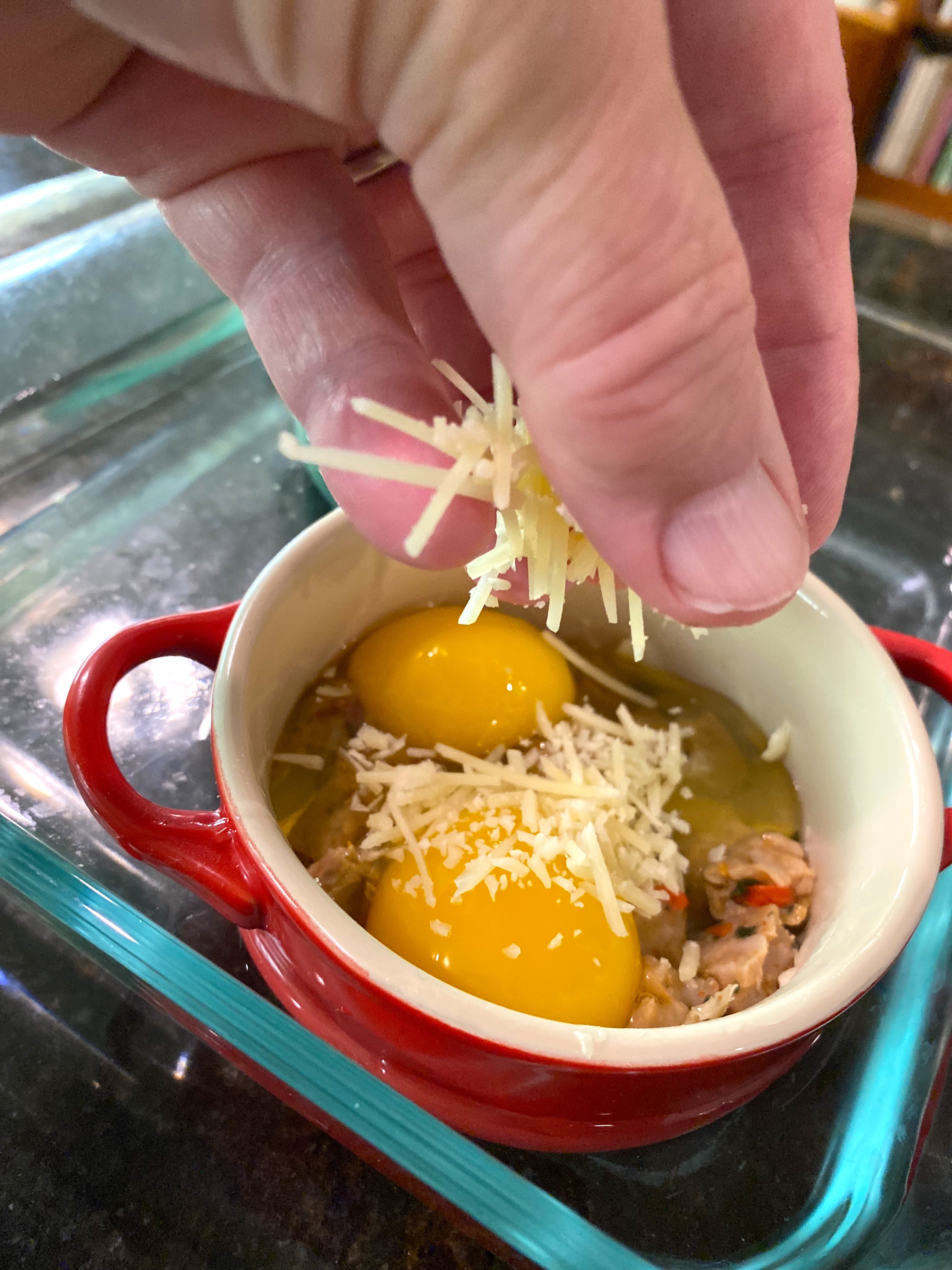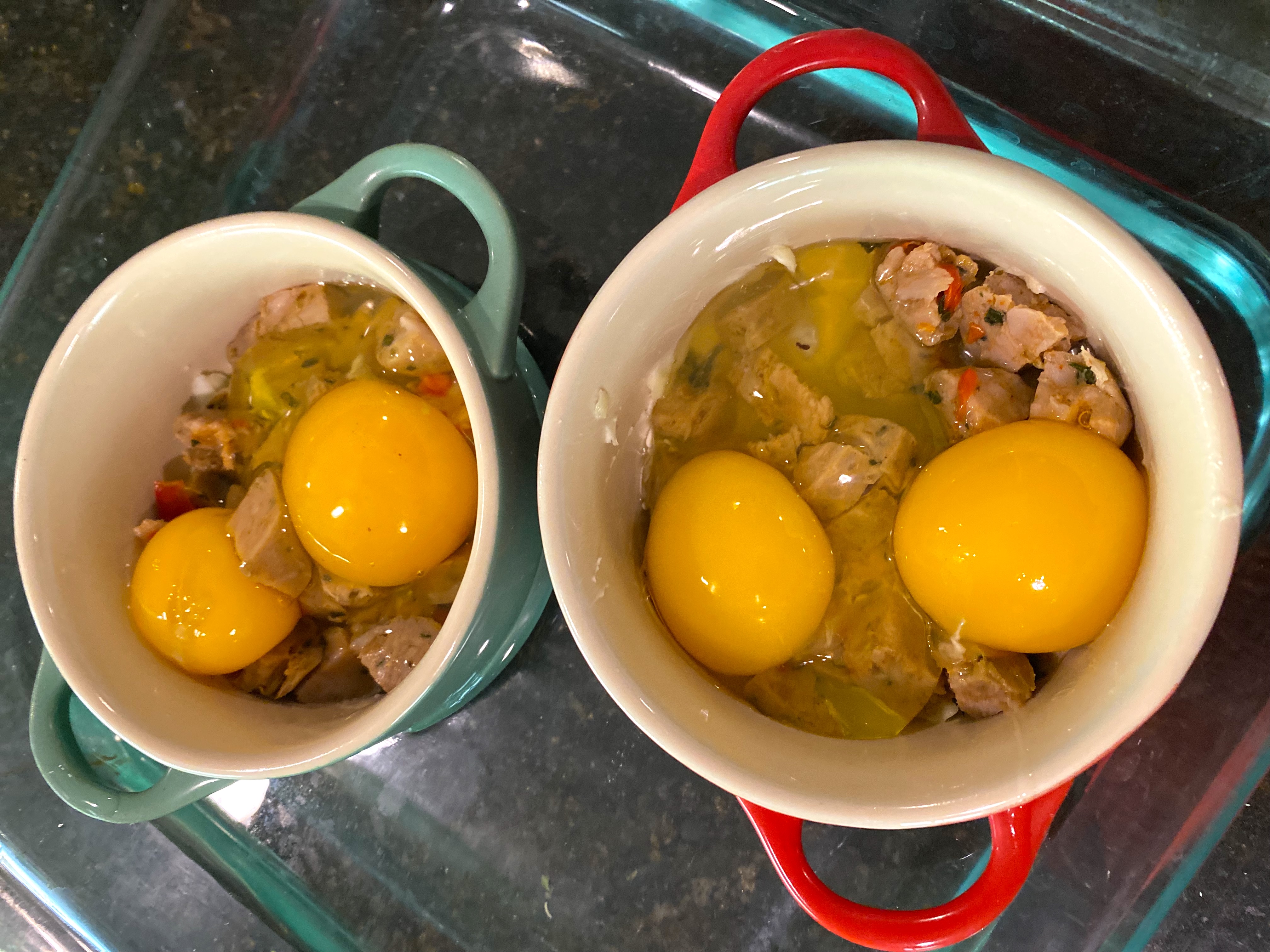 Crack an egg in each – and then take those extra yolks and add one to each dish as well…