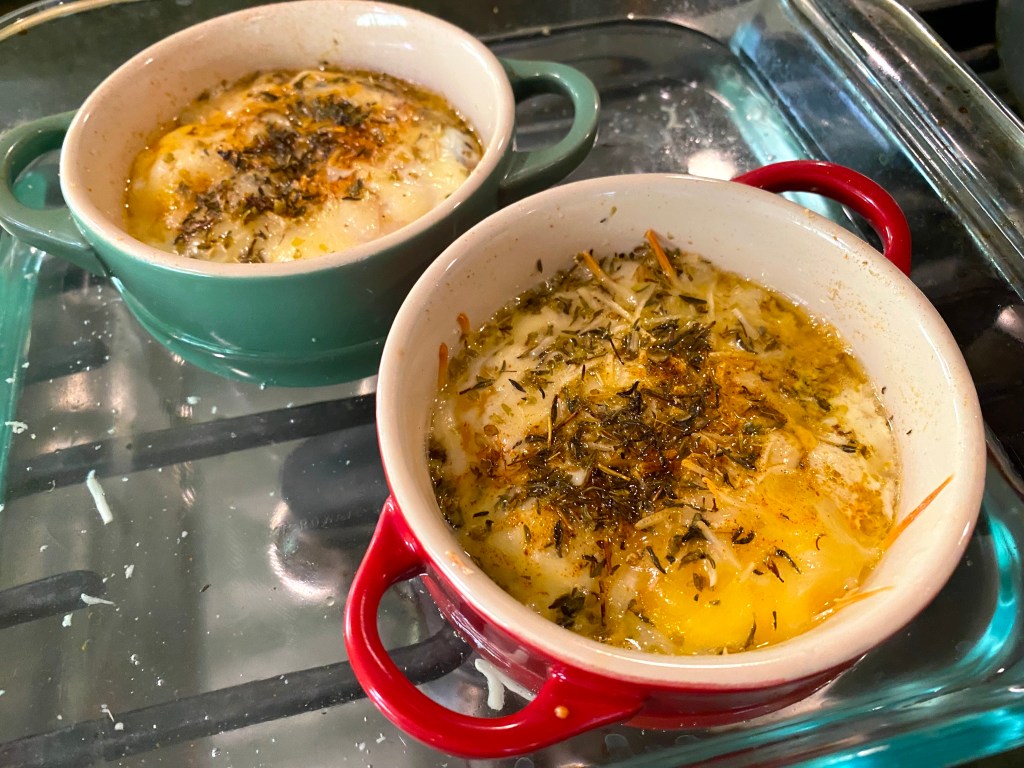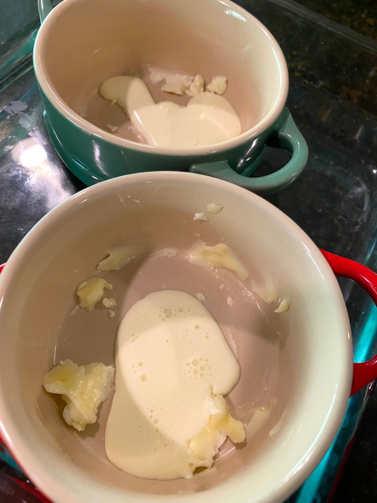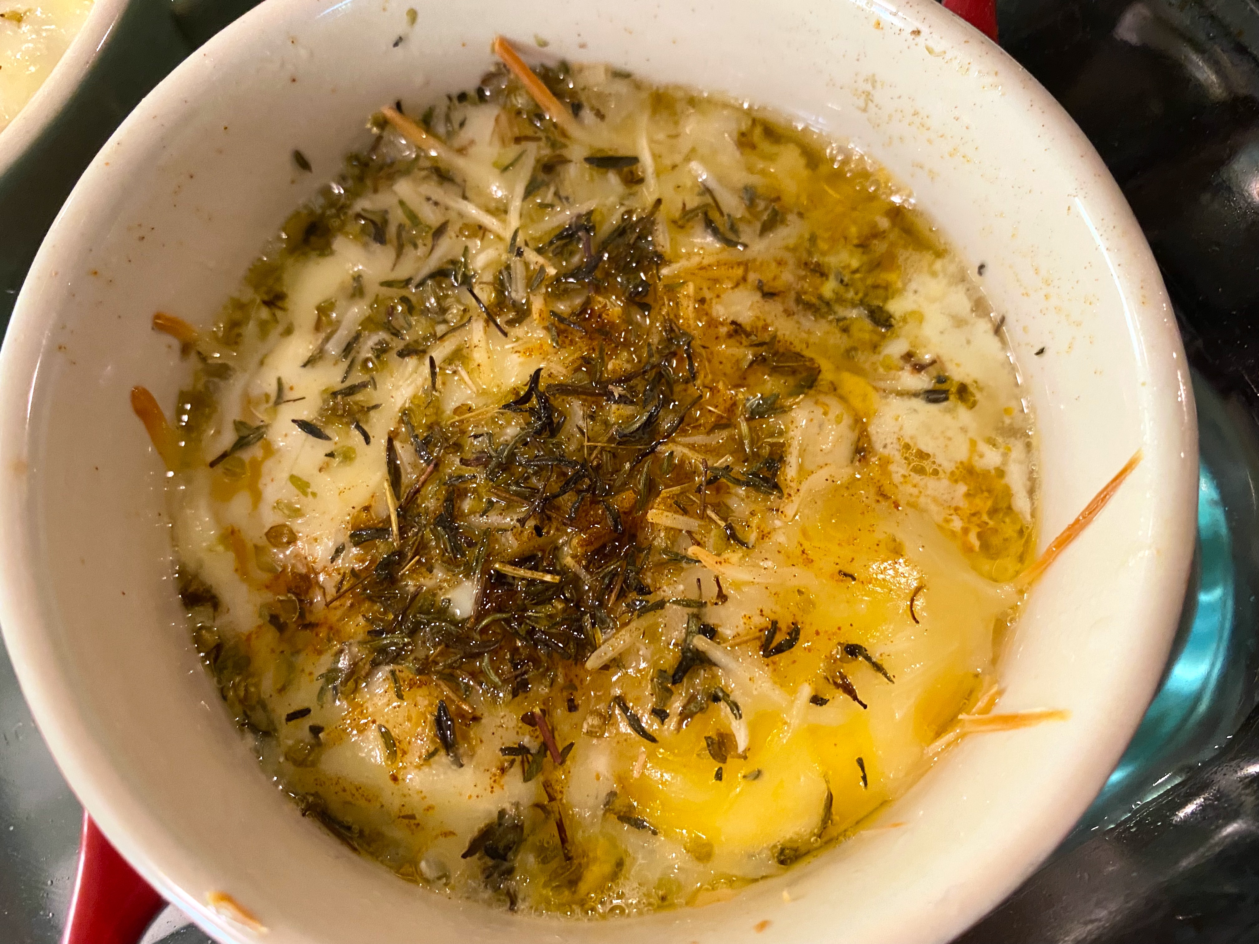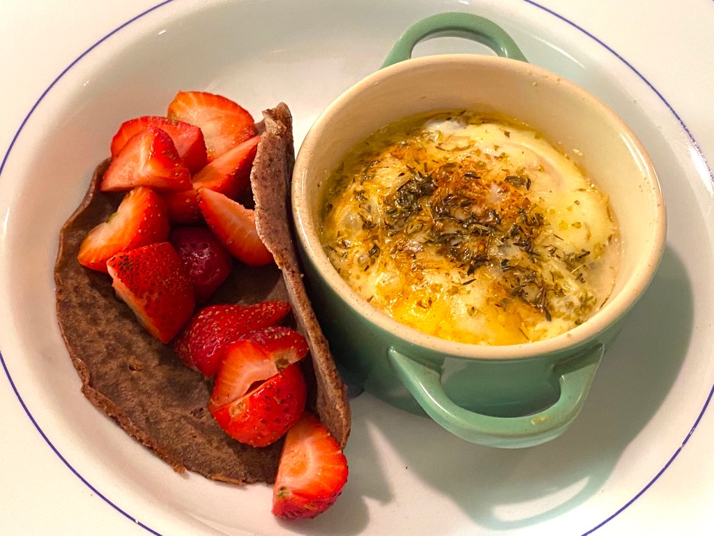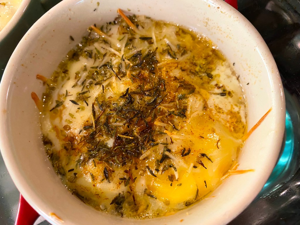This is called a “Bain Marie”; put the ramekins in an oven-ready dish and fill it half full of warm water, which creates a water bath for the eggs to cook in…then put it in the oven for 20-25 minutes and they are done!