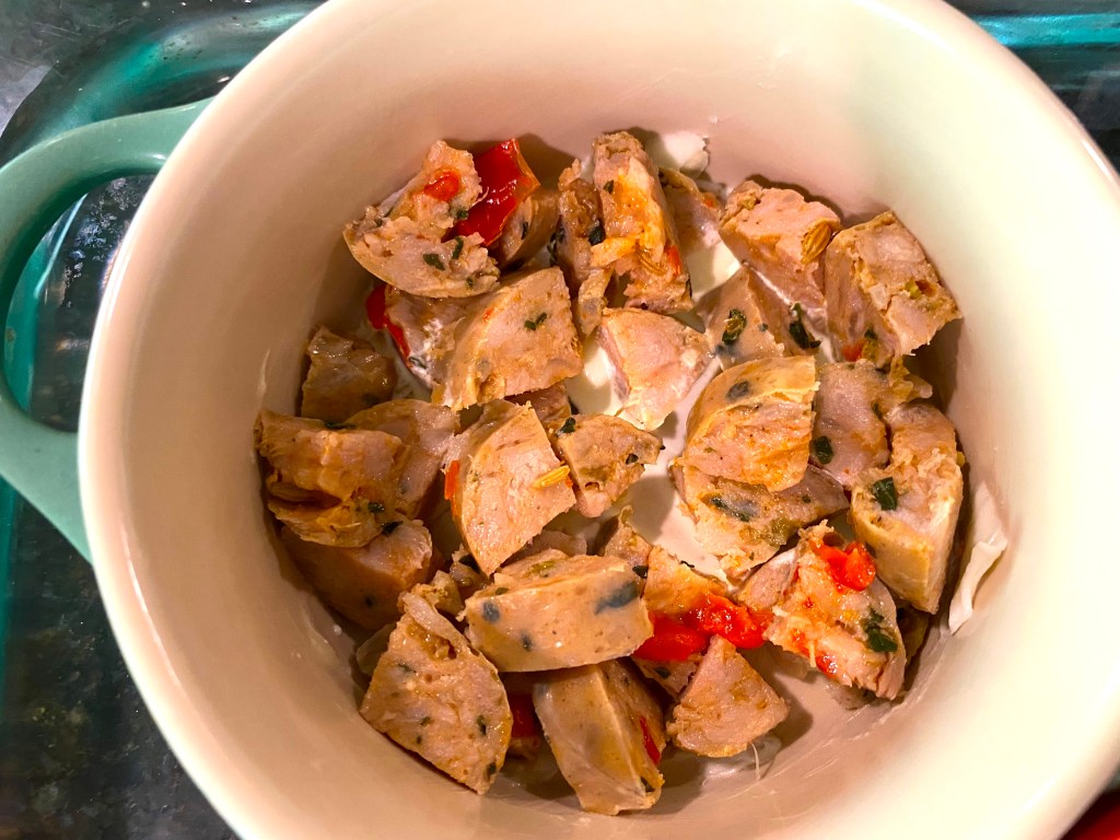 First, turn on your oven to 375 degrees, then rub some butter inside your baking dishes and add a splash of heavy cream, then I chopped up chicken sausage and put some on the bottom of both ramekins as well: