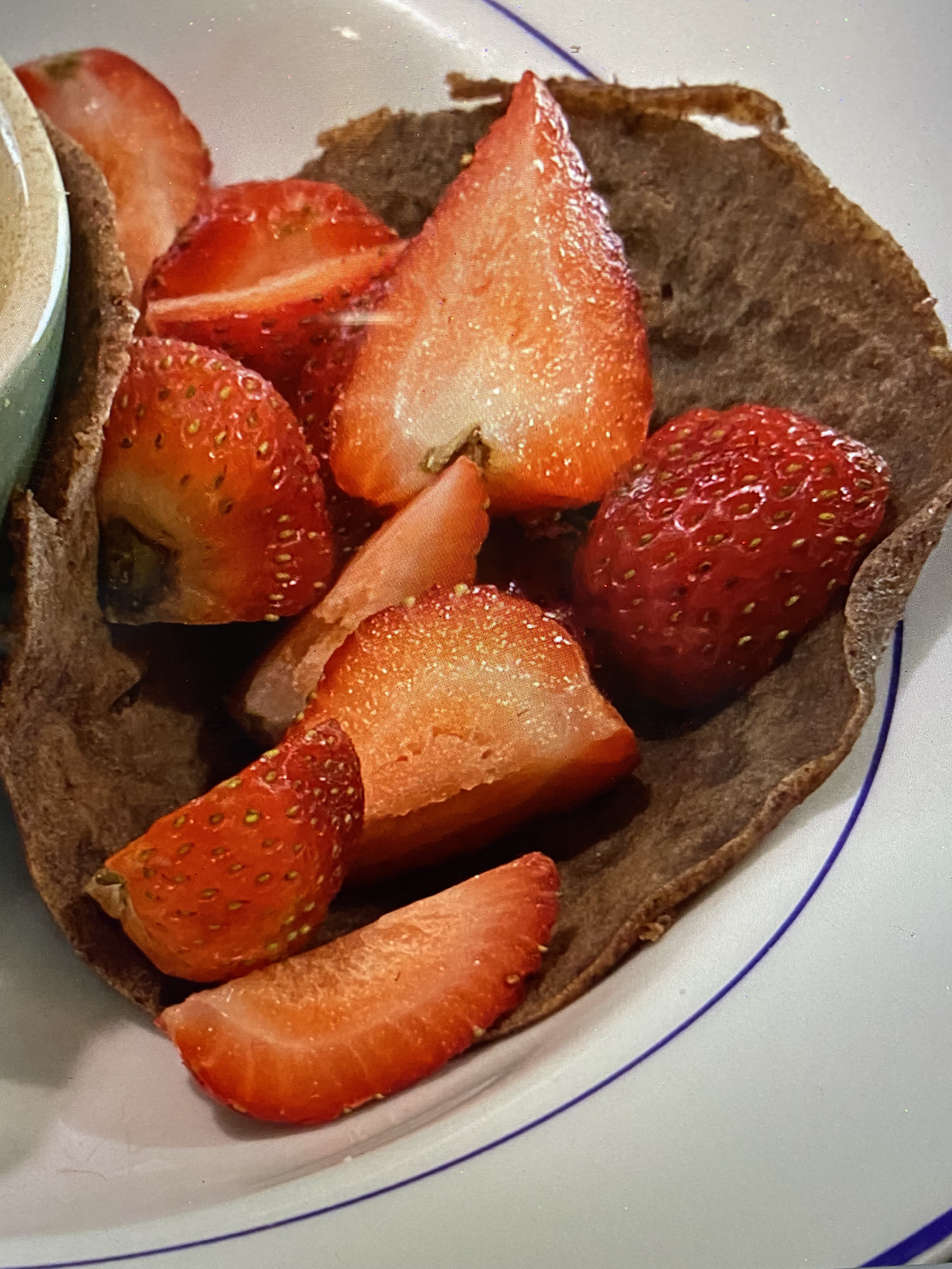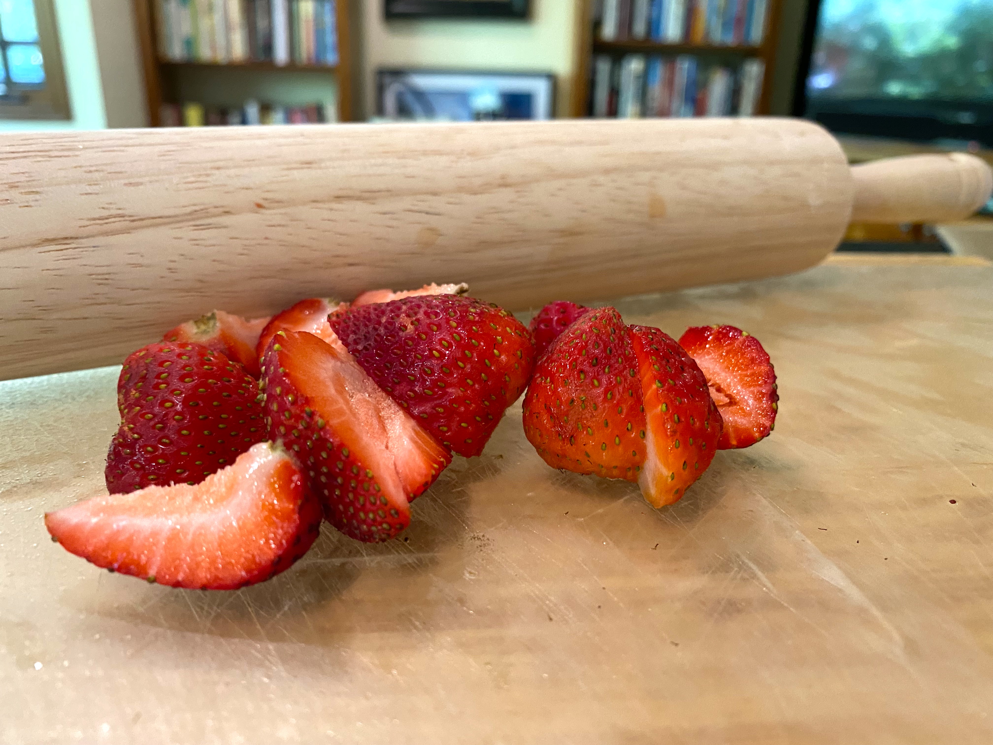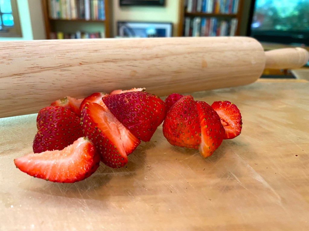 While the Eggs bake in the oven, chop your Strawberries next to a rolling pin and let’s make our Chocolate Tacos!