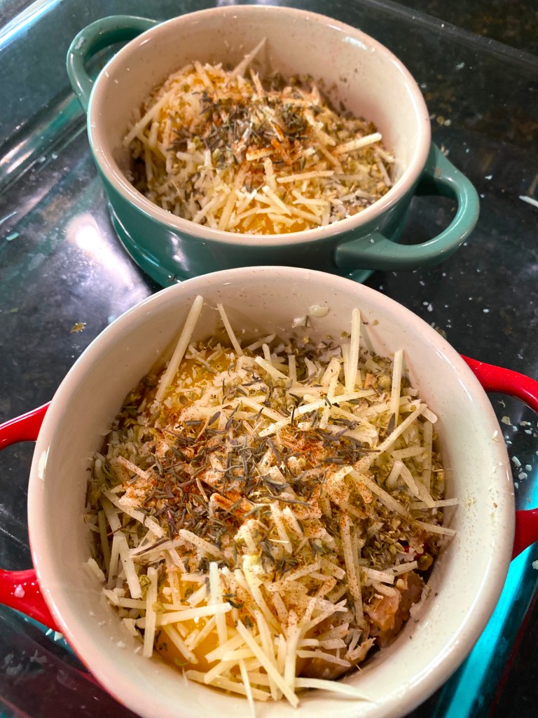 Sprinkle some parmesan cheese on each – then add thyme and park as well…