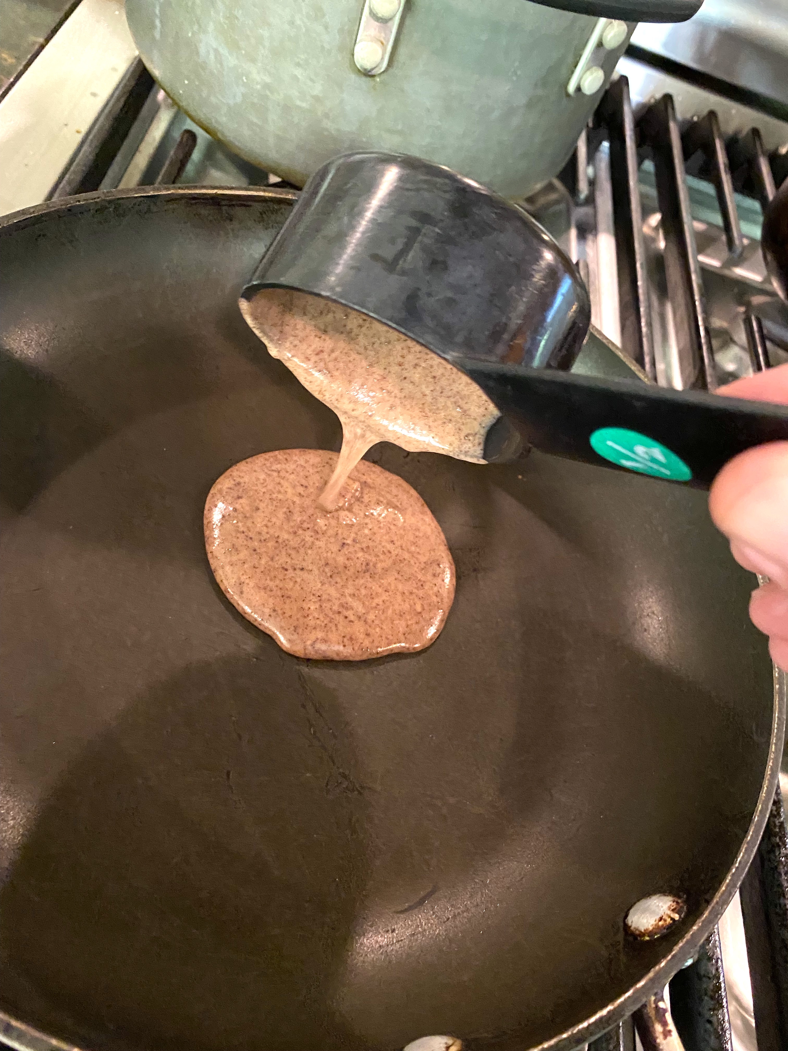 Pour a quarter cup of the batter into a medium hot pan and swirl it around to create a six inch circle…