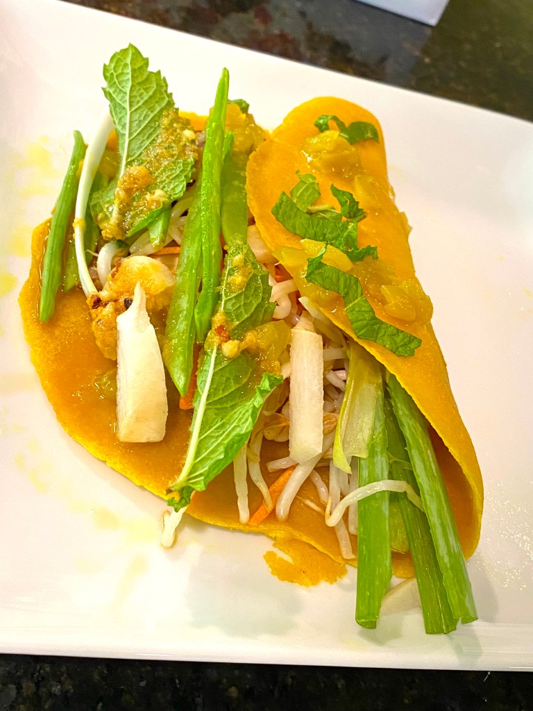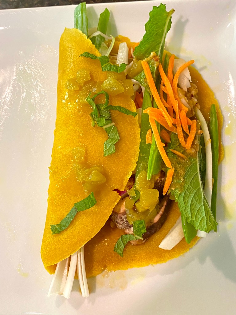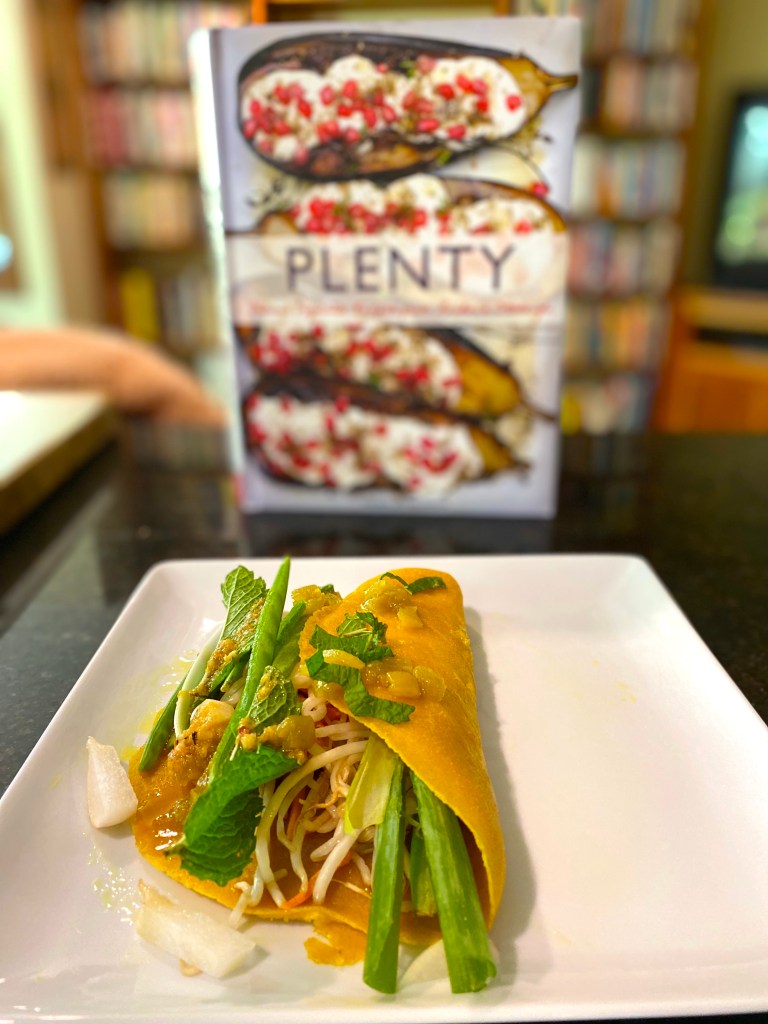 My wife Alex loved the way this “Banh xeo” looked in the book: a Vietnamese pancake with fresh herbs and vegetables stuffed in it, so we decided to give it a shot!
