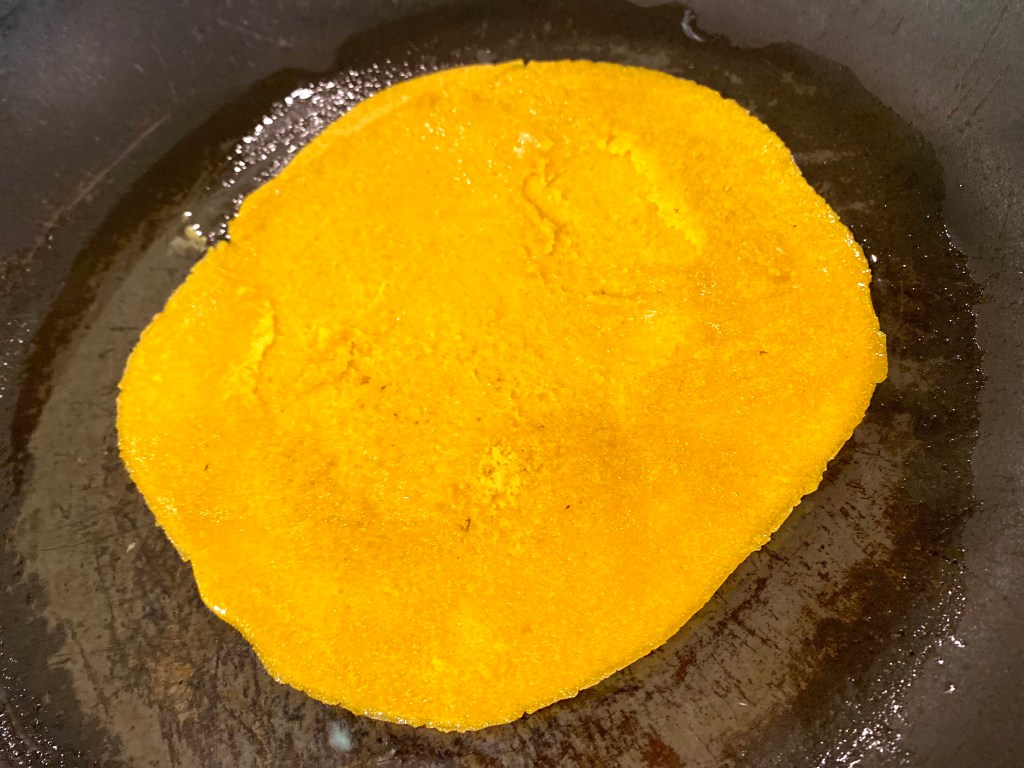 OK, this is the easy part: add the oil to a frying pan and add a quarter of the batter, swirling it around to make it 9-10 inches across…once the underside is golden brown, flip it for another 2 minutes and set aside….