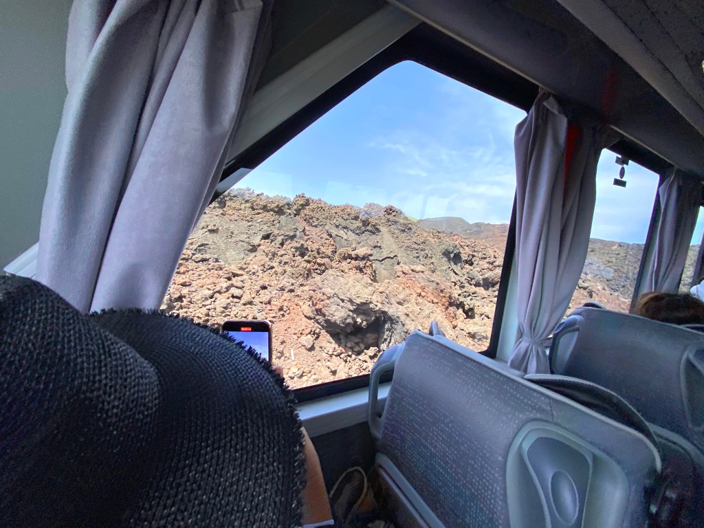 The roads were carved out of dried lava and volcanic ash, so it’s a very rough ride as you slowly wind up the mountain – and the lava is piled along the side of the road all around you: