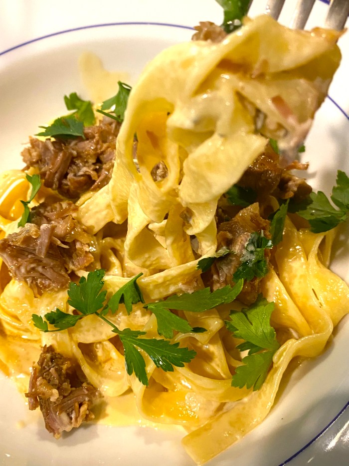 The recipe for this “pulled pork pasta in almond cream sauce” came from one of my TV shows, and you can read about the show and the recipe by clicking here: