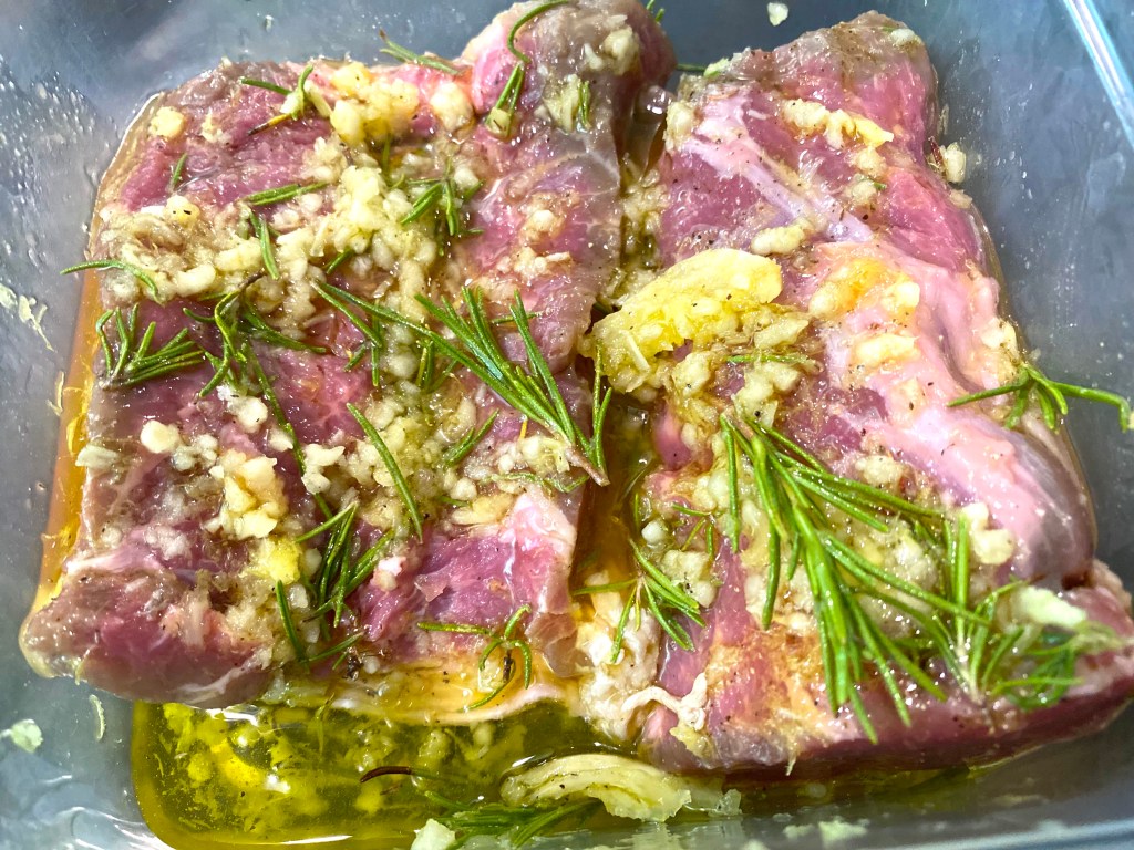 Combine the rosemary, minced garlic, lemon zest, pepper and olive oil in a baking dish. Add the lamb, turning to coat the meat – also rub it in a bit. It will look like this: