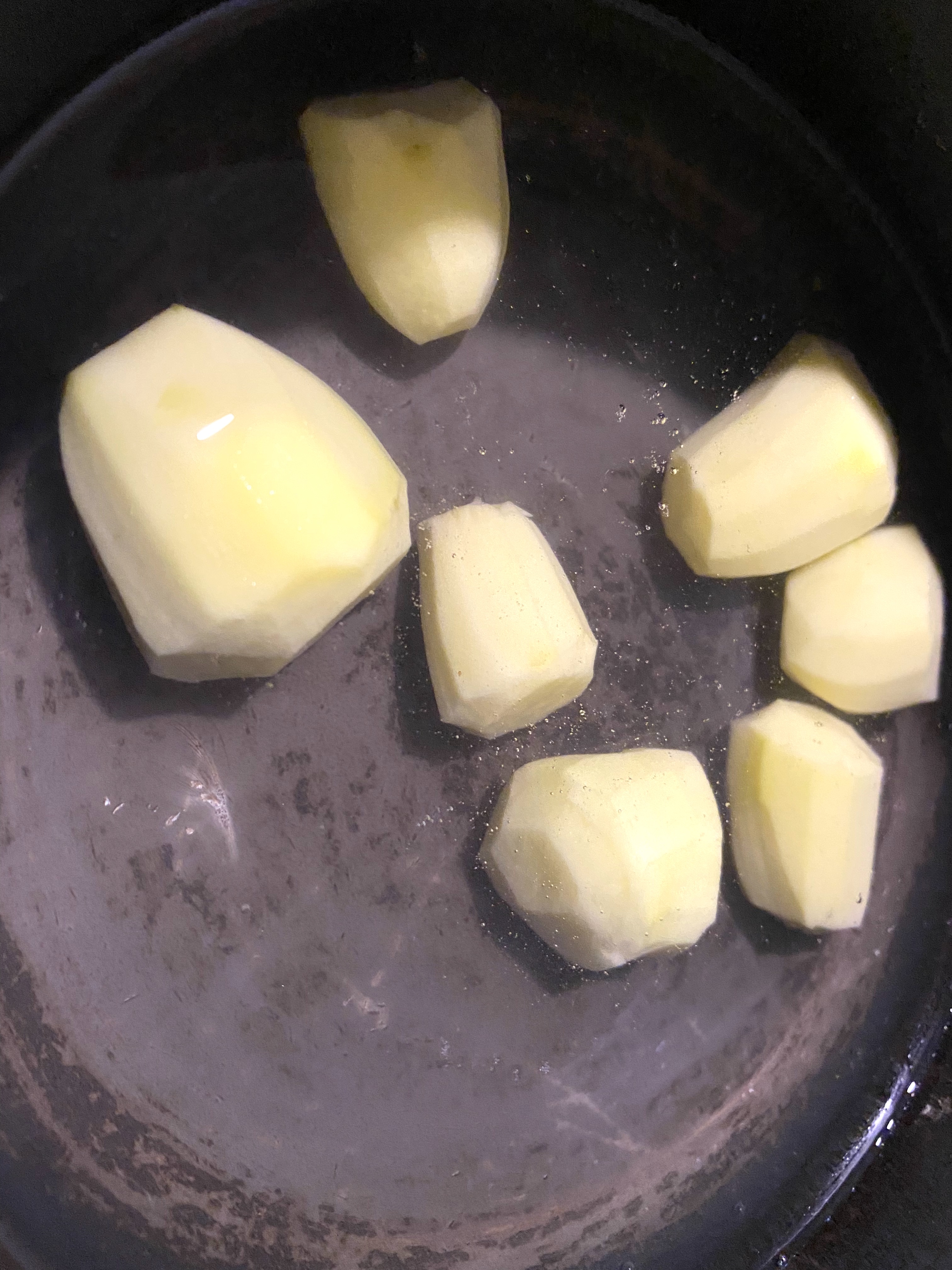 Get those new baby potatoes done and out of the way: peel the new potatoes and boil them in salted water until soft but not mushy…drain and set aside.