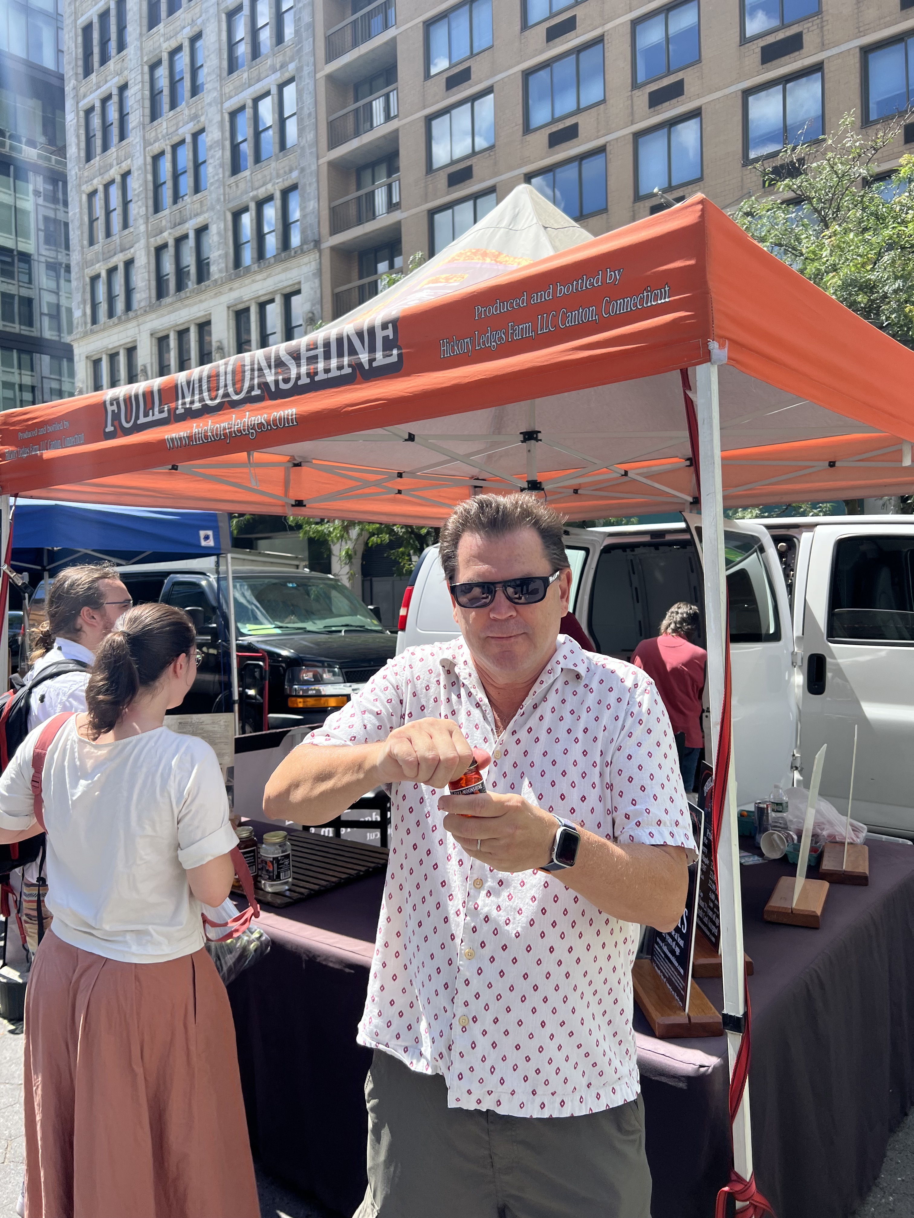 “Full Moonshine” makes distilled liquors in Connecticut, and they bring it to the market where you can sample a jar for $4!