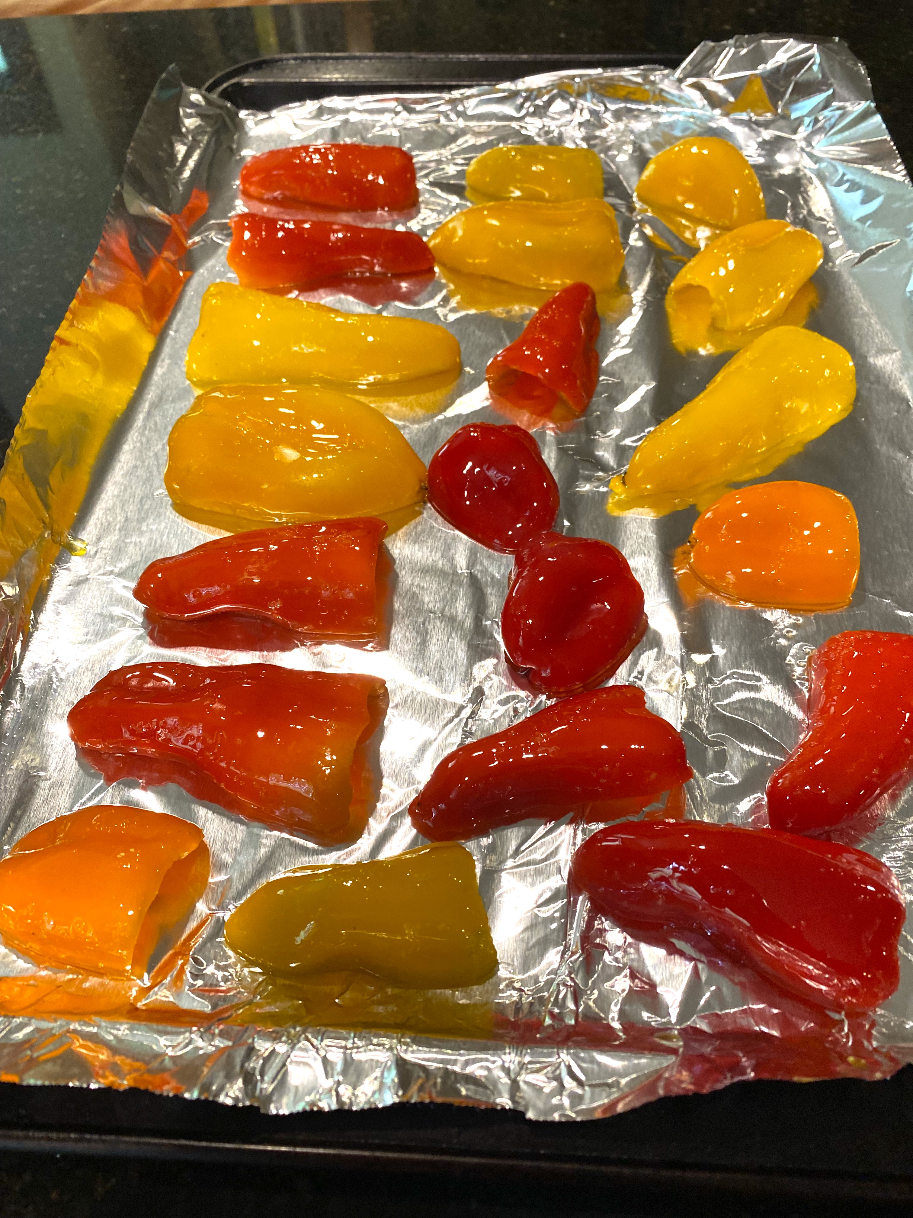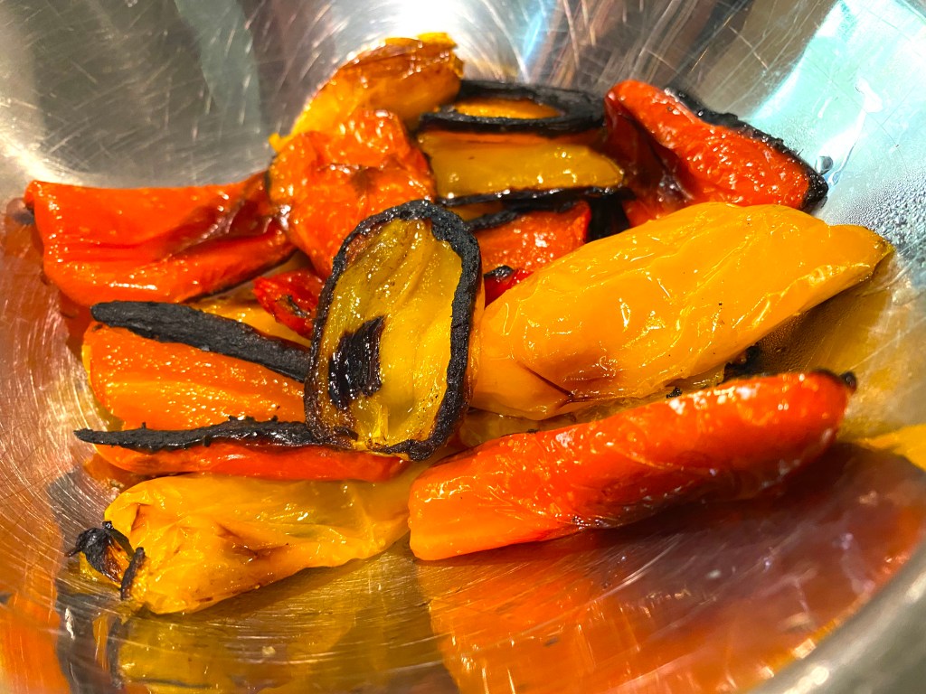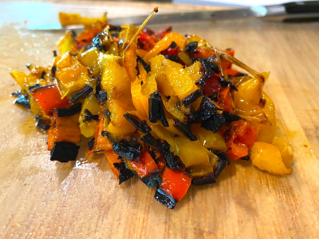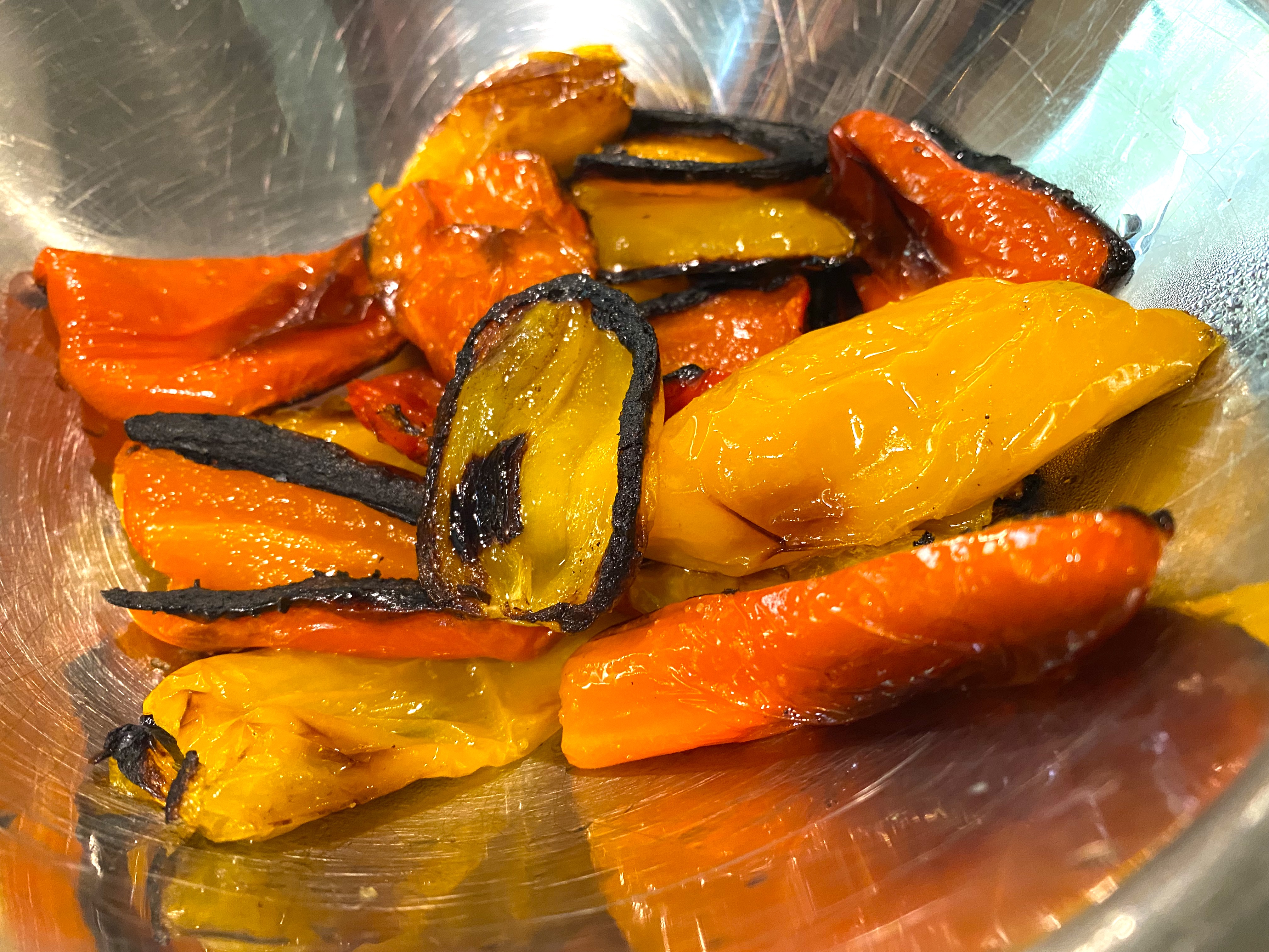 A “piperade” is a combination of roasted sweet bell peppers and the “soffrito.” So let’s roast the peppers!