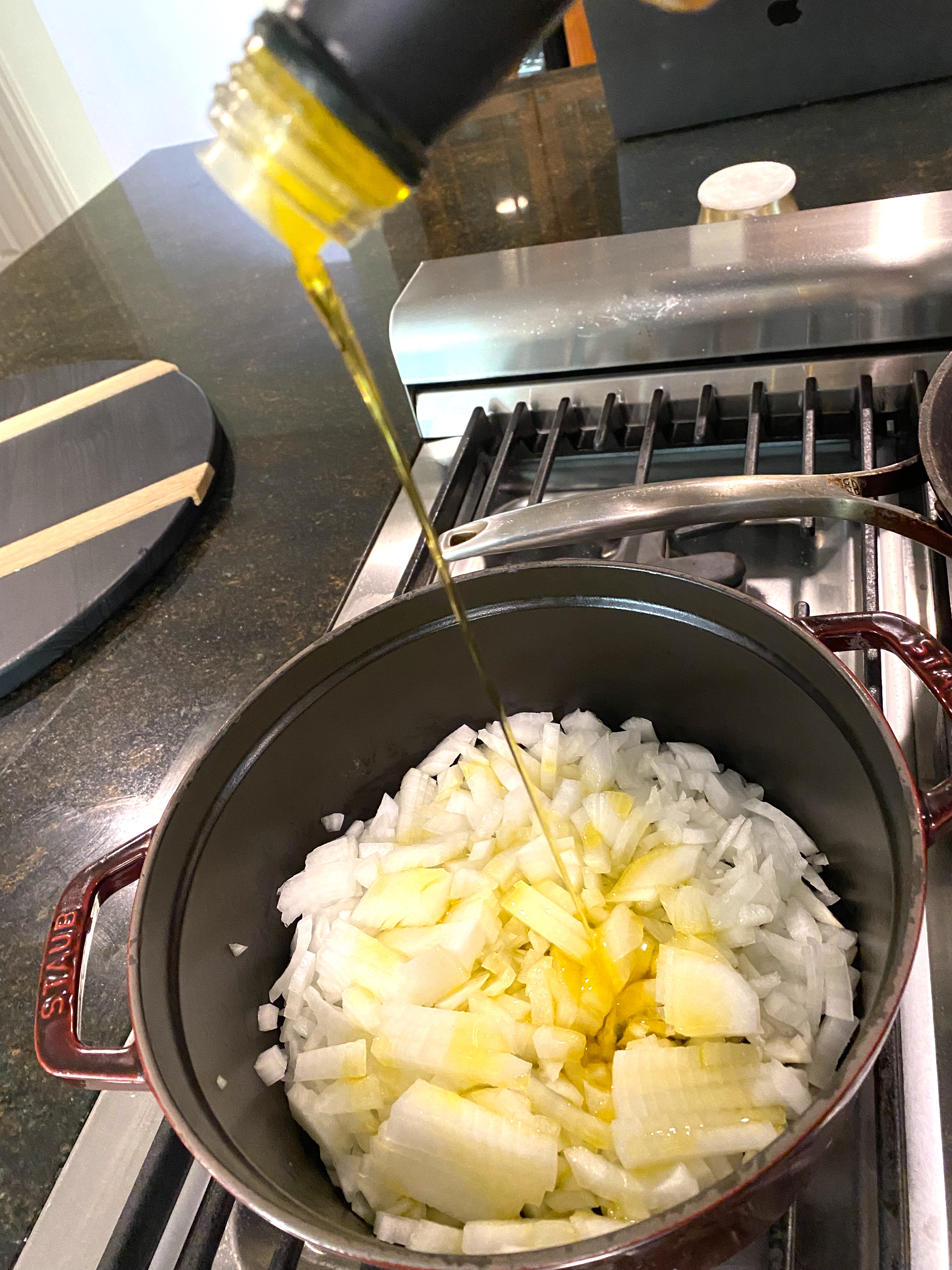 Combine the onion, oil and a pinch of salt in a saucepan and put over medium heat…once the onions begin to cook, lower the heat and cook the onions for 2-1/2 hours until a rich golden brown.