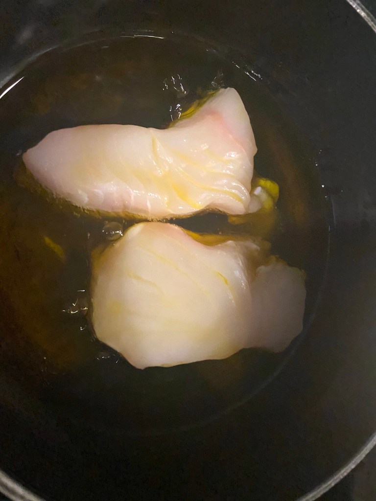 Place the Halibut in a sauce pan that just holds them, and add your olive oil, making sure they are covered.