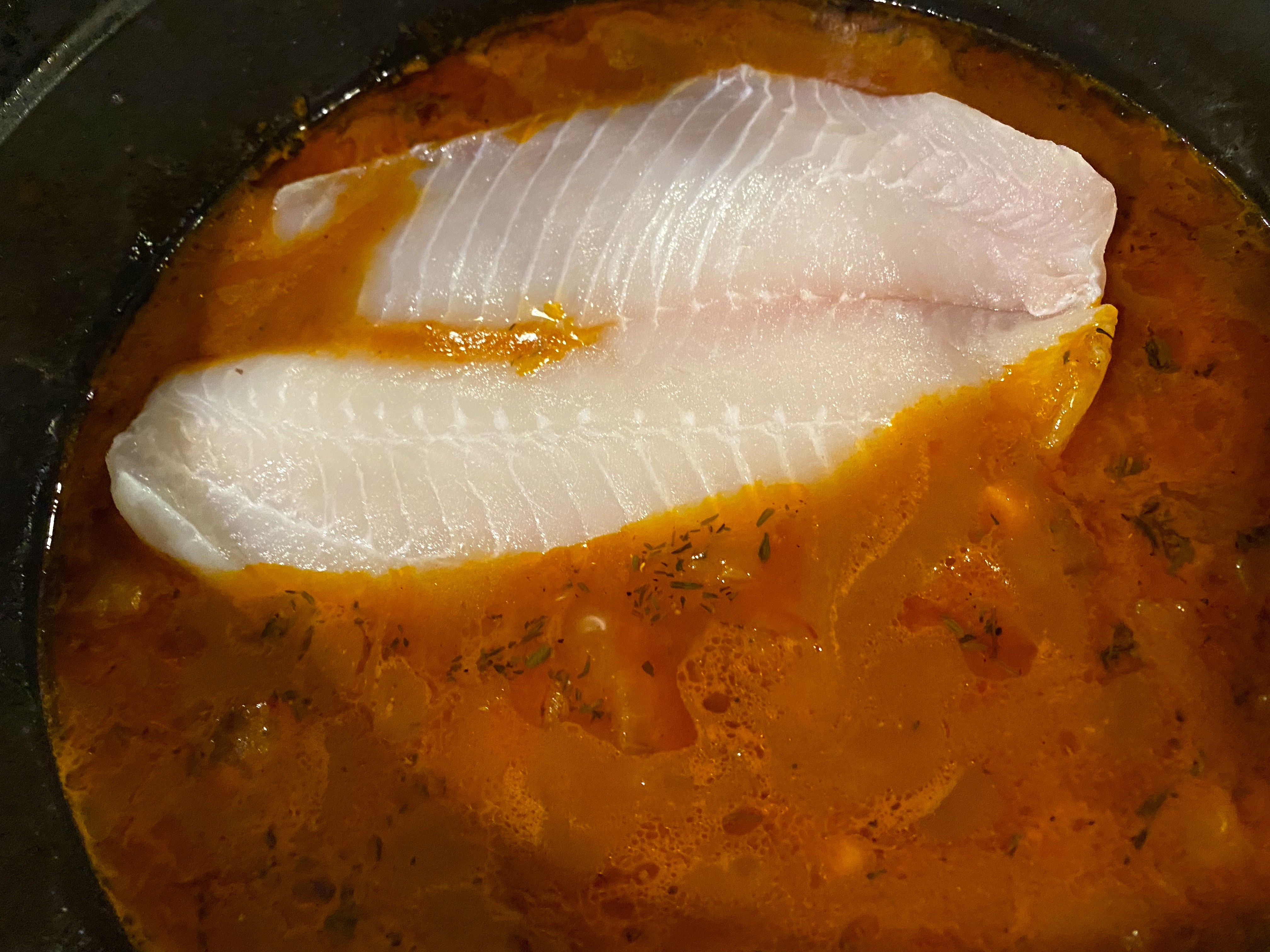 The recipe calls for 5 pounds of fish – here’s where they ask you to remember the golden rule: “GIGO!” That’s means “garbage in, garbage out.” So use good fish! Snapper, halibut, sea bass, tilapia – as much as you want for a meaty delicious soup!