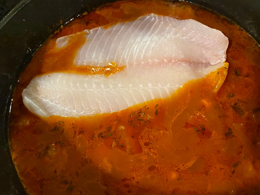 Add all of the remaining ingredients except the sherry peppers and rum – and have a nice drink with the rum I you like – and ease those fish filets into the rich sauce…