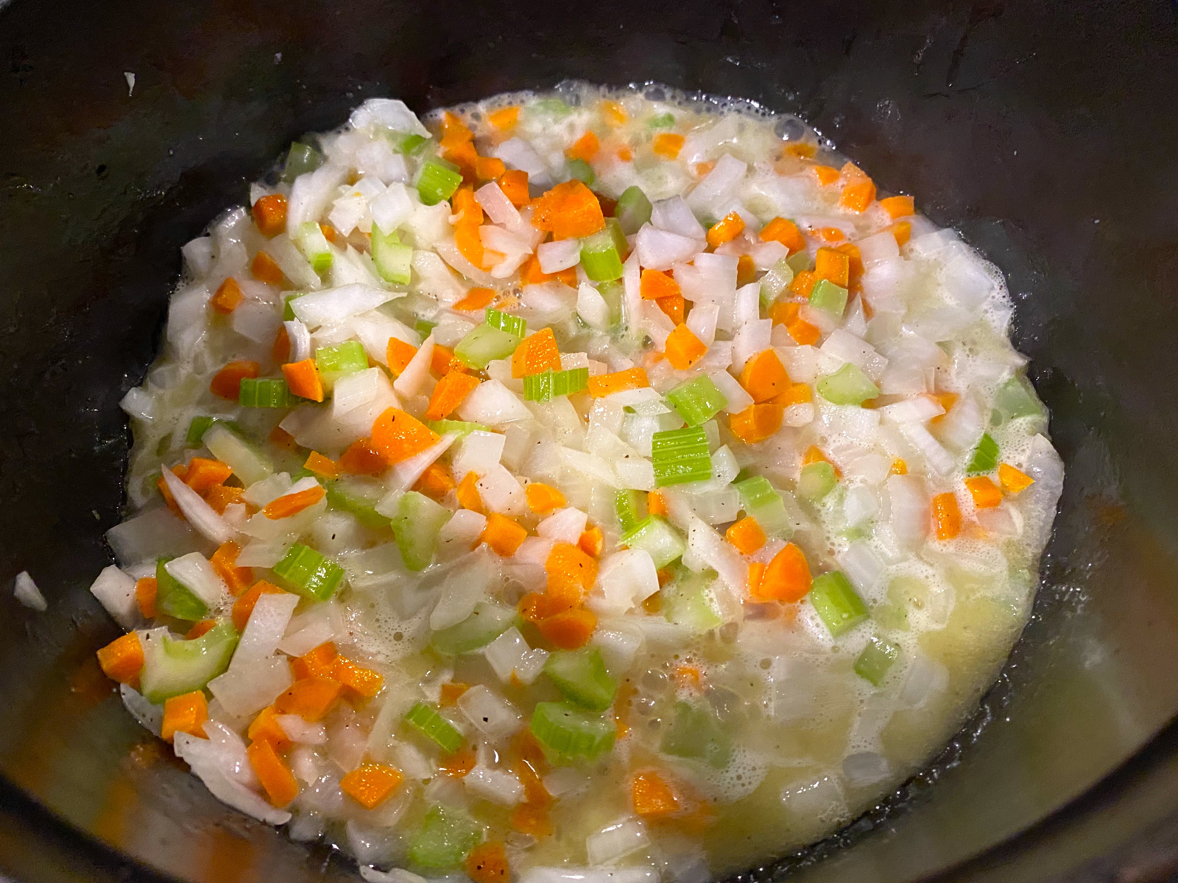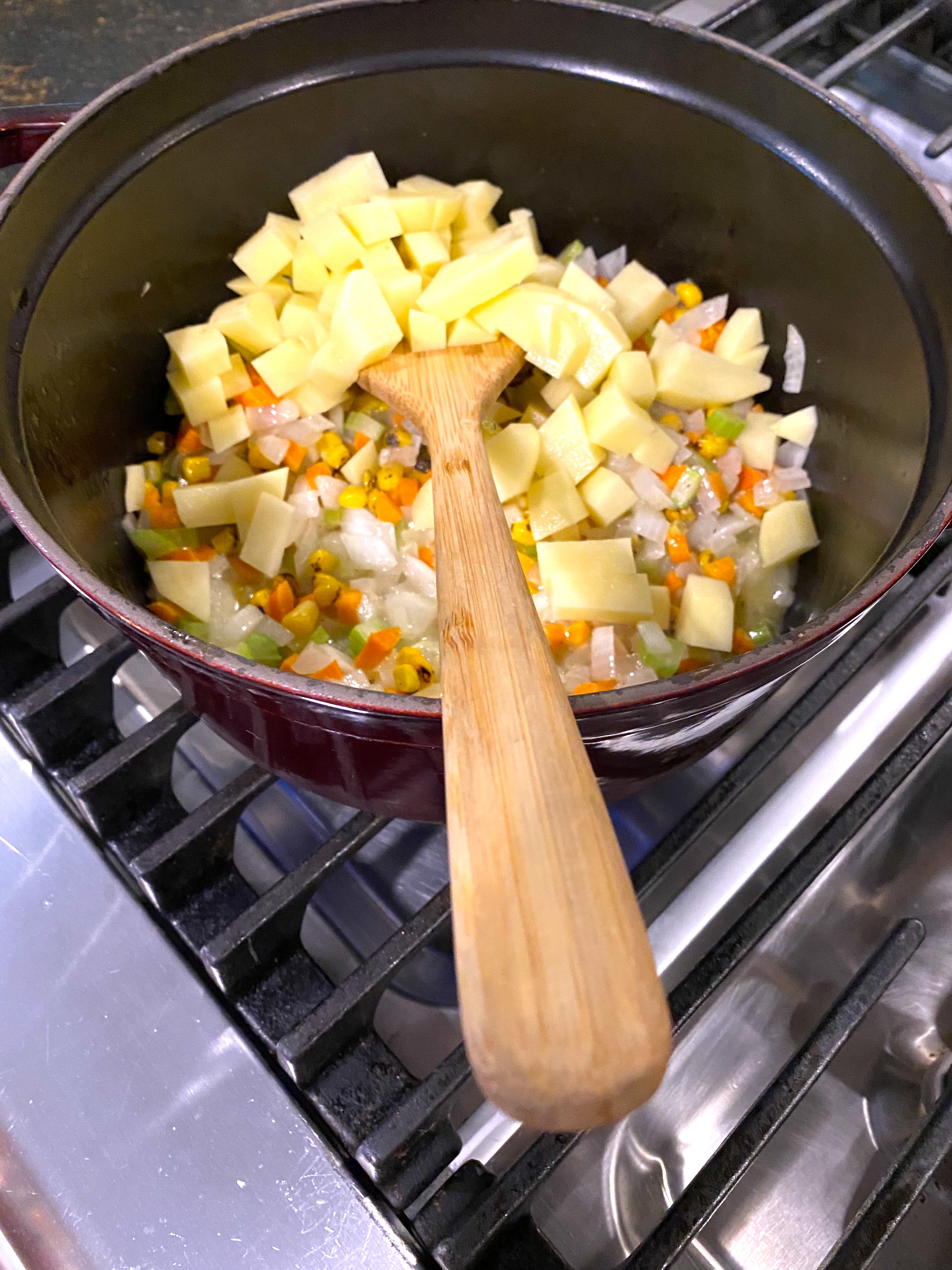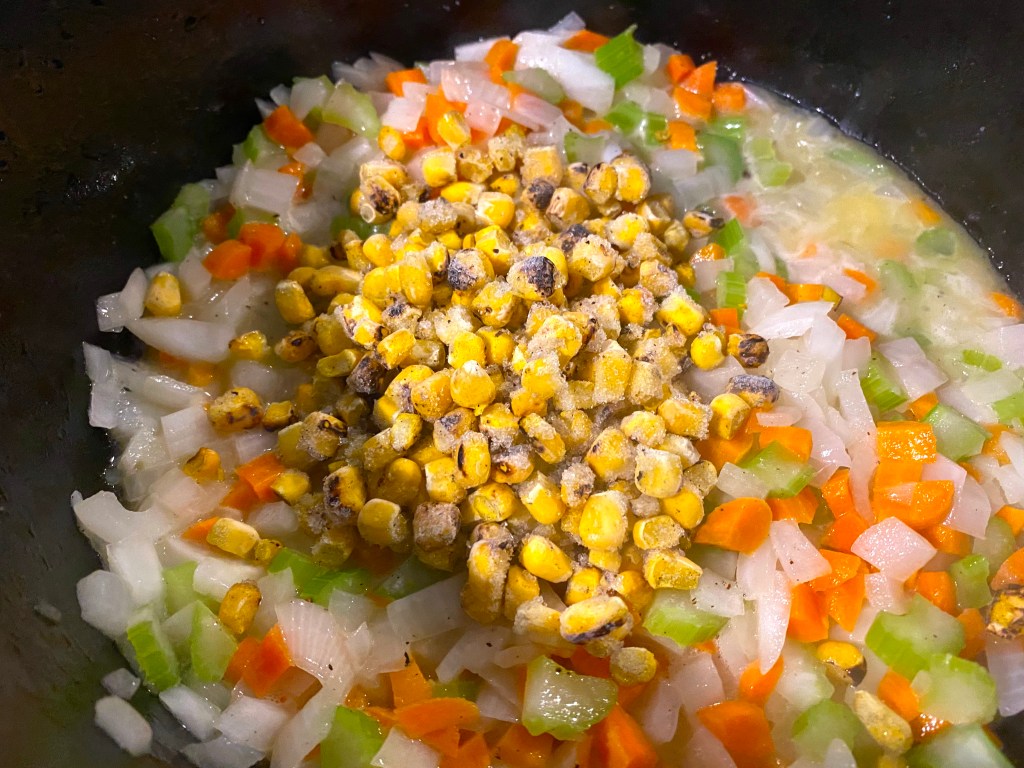 Saute all vegetables for ten minutes in butter. As some of you know, I like to “jazz” up my recipes, so I added some frozen roasted corn to the recipe: